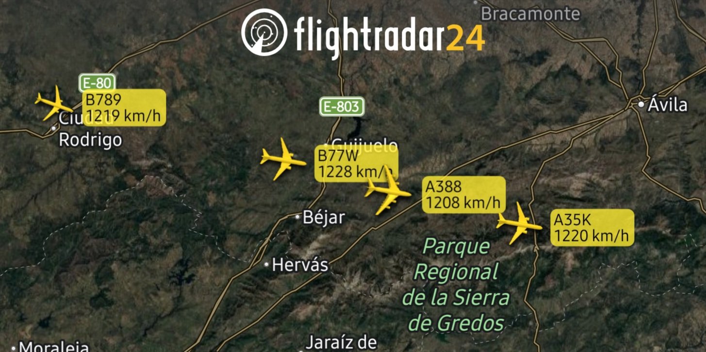 Aviones de pasajeros superando la velocidad del sonido (1062 km/h a altitud de crucero) sobrevolando la Península Ibérica durante estos días de fuertes vientos;