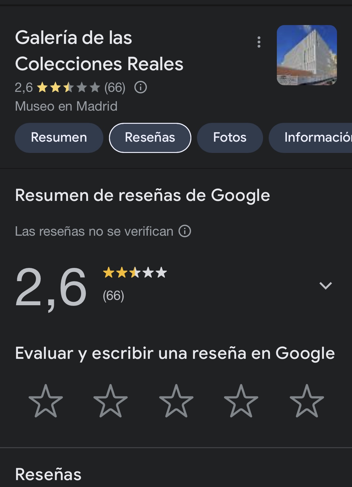 Es como si tienes dos días en Florencia, y el día que has preparado para los Uffizi te la encuentras cerrada por un acto oficial; pues lo primero que haces es entrar a TripAdvisor y ponerla a caer de un burro; pero hablo desconociendo las razones de la puntuación de la “Galería de las Colecciones Reales”.