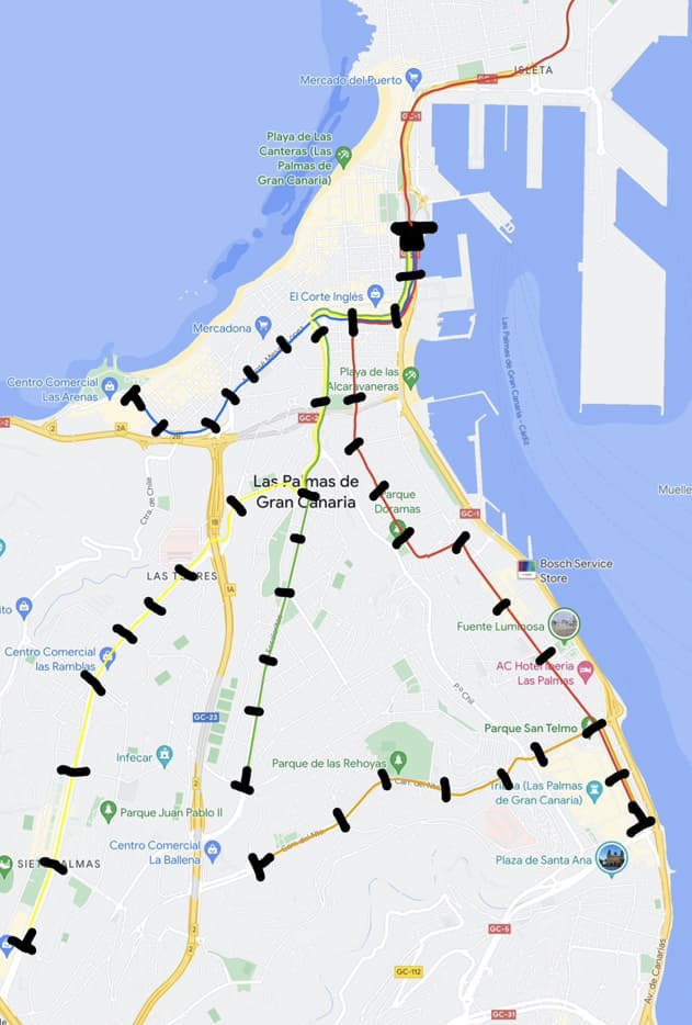 Hace tiempo me dió por pintarrajear como podría ser una red de tranvías en Las Palmas, incluso podría extenderse la verde y marrón hasta 7 palmas.