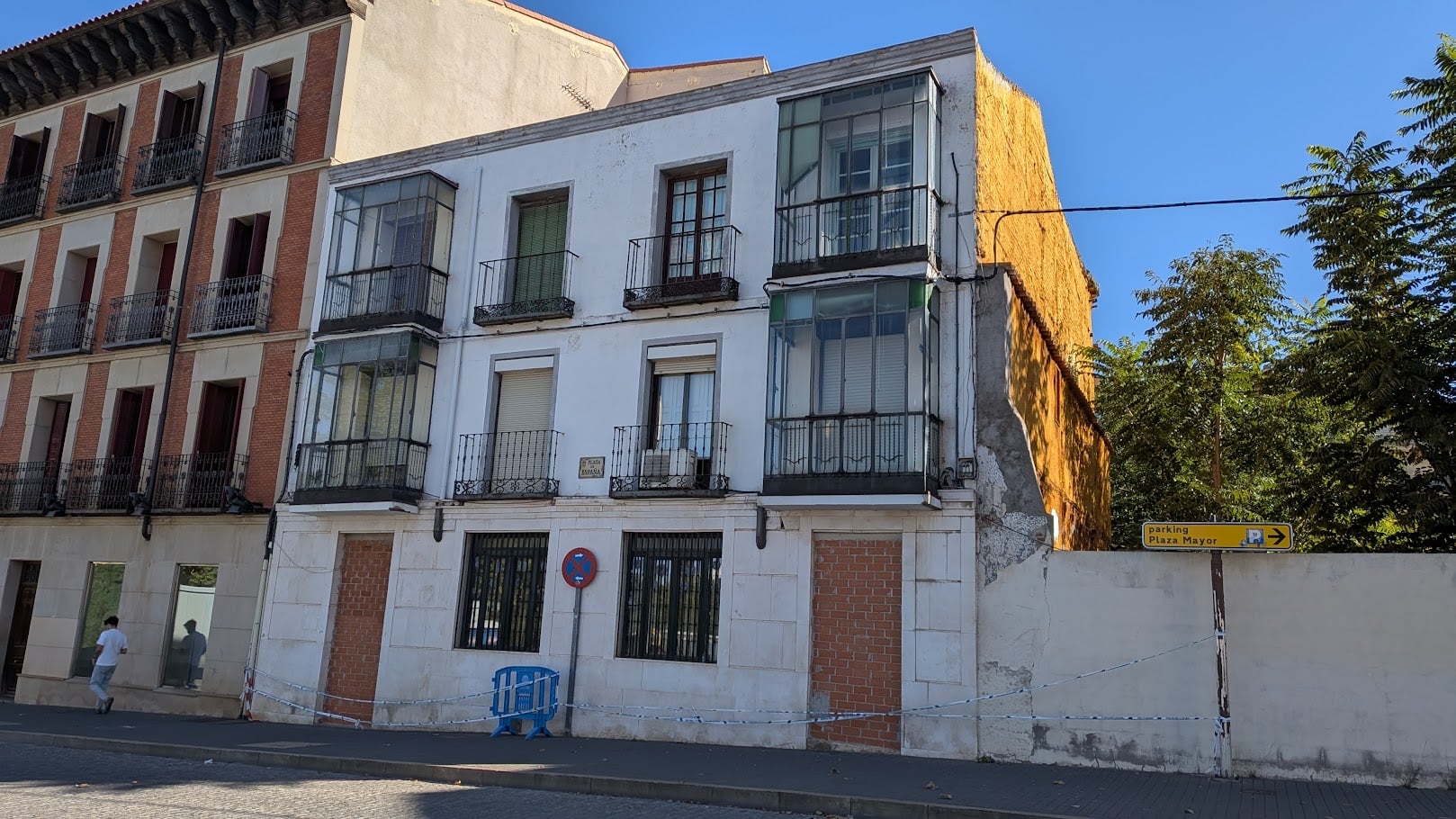 Miedo me da esta reforma de la Plaza de España, que además de innecesaria, añadiría ruido visual frente a uno de los principales monumentos de la ciudad: los árboles junto al carril bici, la hilera de macetones, la pérgola frente al acceso al museo