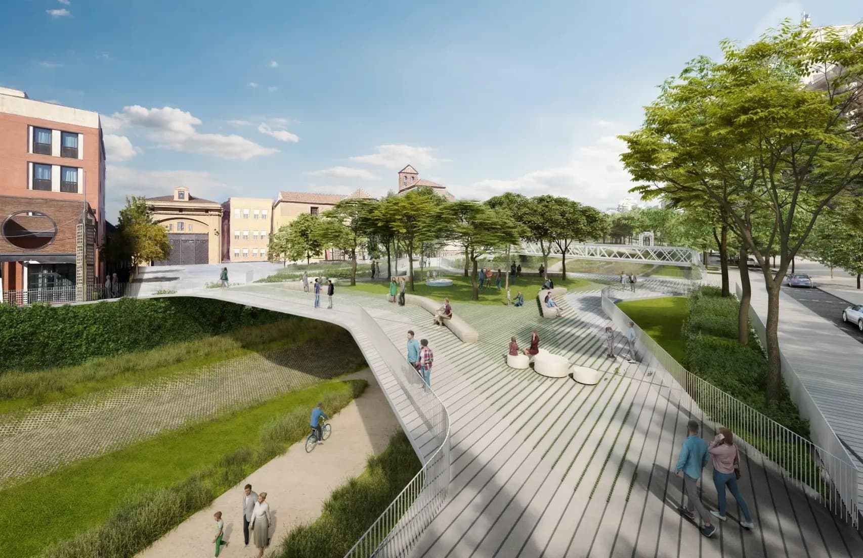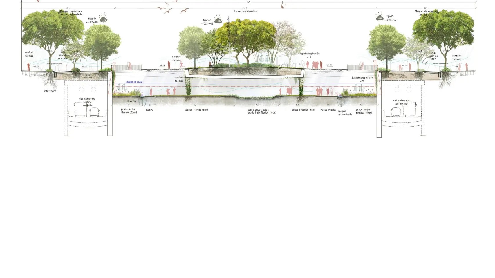 Un poquito de recogida de cable por aquí y bastante verde por allá, y voilá! Parece que vamos a tener un parque urbano en lugar de un río, pero la realidad es otra: si la obra terminase mañana mismo, se tardaría décadas en verse así de verde y frondoso…