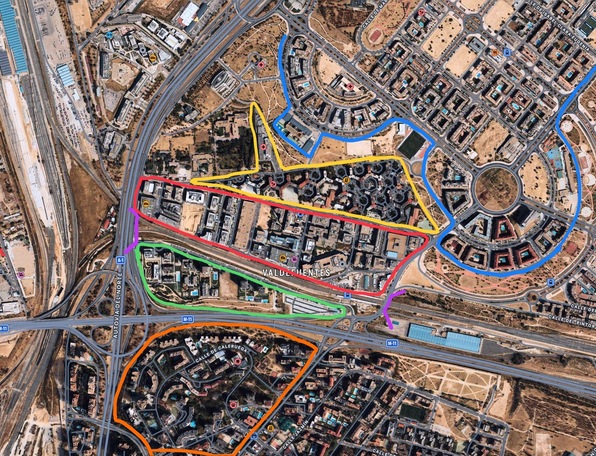 La zona roja de tipo más industrial y oficinas completamente desconectada de la zona amarilla más residencial y el hospital HM, a su vez muy desconectada de Sanchinarro.