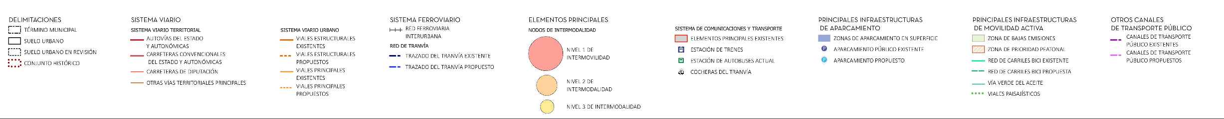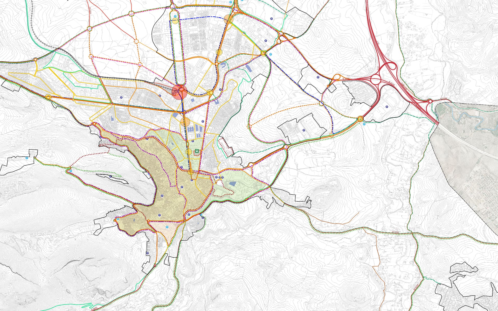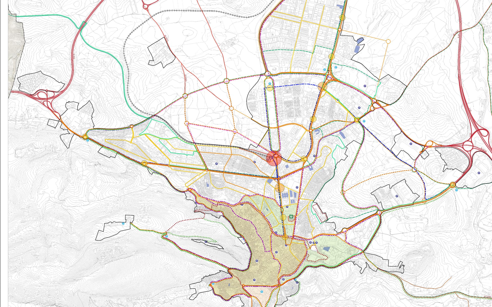 Adjunto también la propuesta de movilidad con las líneas de tranvía propuestas (un disparate si me preguntas, ya me parece un despropósito la actual). También se recoge como nivel 1 de intermodalidad el entorno actual de la estación de tren. Si algunos no sabéis, es una de las ubicaciones a barajar para la nueva estación de autobuses (en estudio de ubicaciones aún con la junta).