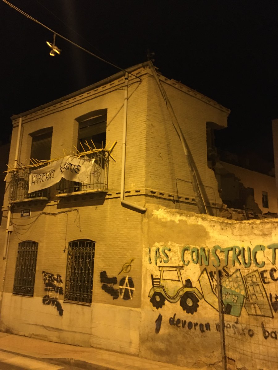 No sé yo si hacer grafitis anarquistas y cubrir con patas de valla los balcones ayuda a la “defensa” del neomudéjar