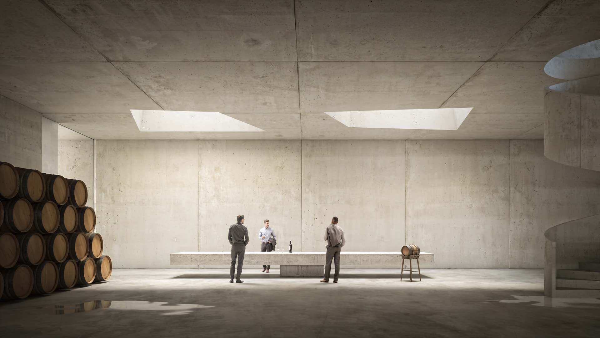 ADICIONALMENTE, SE HA DISEÑADO UN GRAN ESPACIO DIÁFANO SUBTERRÁNEO DESTINADO PARA LA CRIANZA DEL VINO, ILUMINADO DE MANERA DELICADA A TRAVÉS DE UNOS ESCULTÓRICOS LUCERNARIOS DE HORMIGÓN QUE SOBRESALEN DEL TERRENO Y SON VISIBLES DESDE EL EXTERIOR.