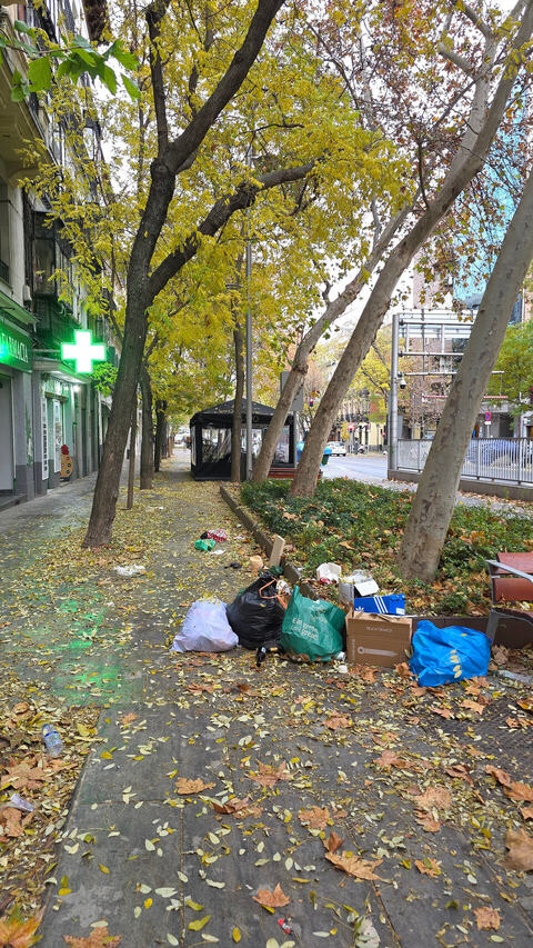 Bueno, a mi me gustaría saber quién ha dejado esa basura ahí, no parece su sitio. Respecto al tema de las hojas, y hablo con conocimiento de causa porque tengo dos amigos que viven en la plaza, los vecinos han pedido varias veces que no se recojan porque están hartos ya de por si del ruido de las terrazas, como que para cuando hay silencio, vengan a recoger las hojas con las sopladoras…