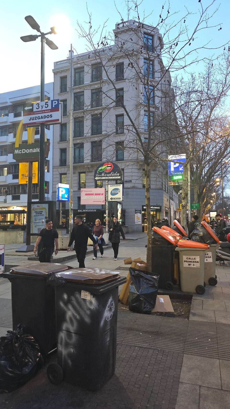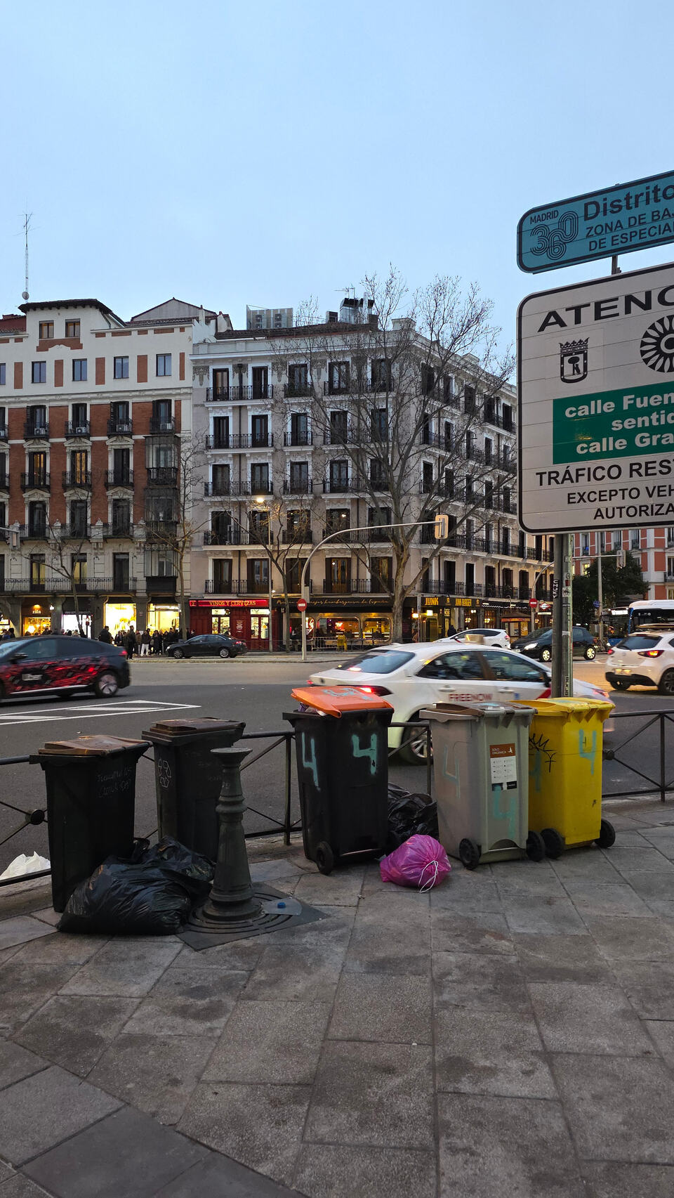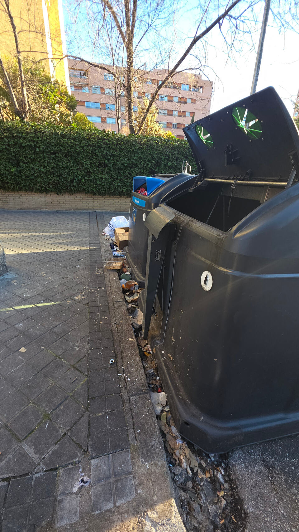 Plaza de los Cubos (de basura) haciendo honor a su nombre. Y como ya hace calorcito, el hedor que sueltan es notable