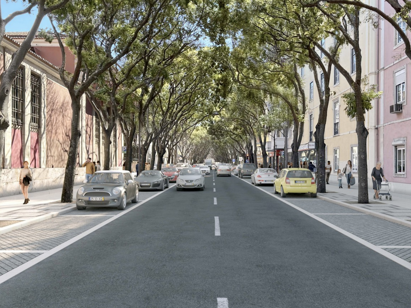 Podría ser, pero la solución mantiene el adoquin en las plazas de aparcamiento y juega con las baldosas en las aceras, a mi me parece bastante elegante.