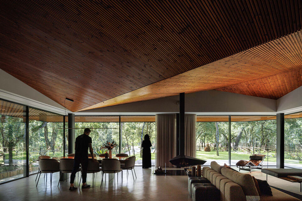 La vivienda, compuesta por cuatro volúmenes, se construyó y cultivó en armonía con el paisaje y el tiempo a lo largo de ocho años, ubicando cuidadosamente cada volumen en las mesetas naturales, respetando la topografía del terreno, así como sus robles y alcornoques centenarios.