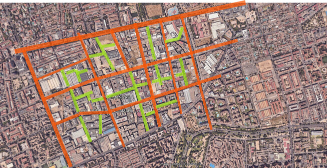 El cambio del trazado de MadBit desde la ortofoto es significativo. Aparecen nuevas avenidas, se ensanchan calles, manzanas repletas de naves pasan a tener bloques con zonas abiertas y jardines.