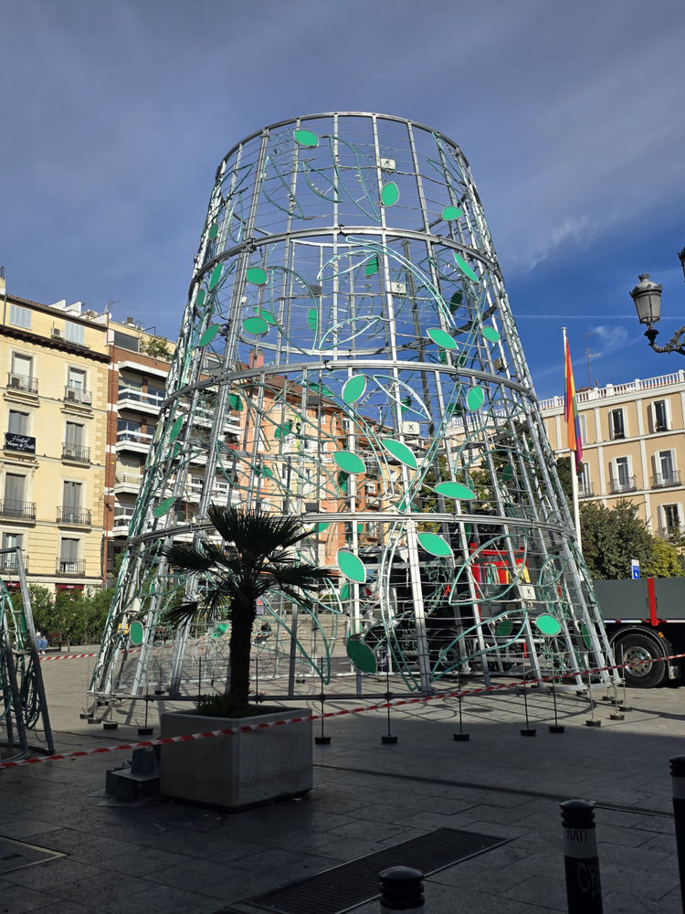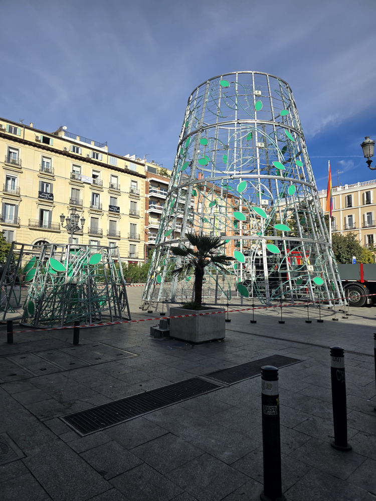 El alumbrado de la plaza de Chueca es espectacular y no está terminado del todo…Aún quedan como escaleritas colgando entre medias de las lamparas rellenando toda la plaza entera.