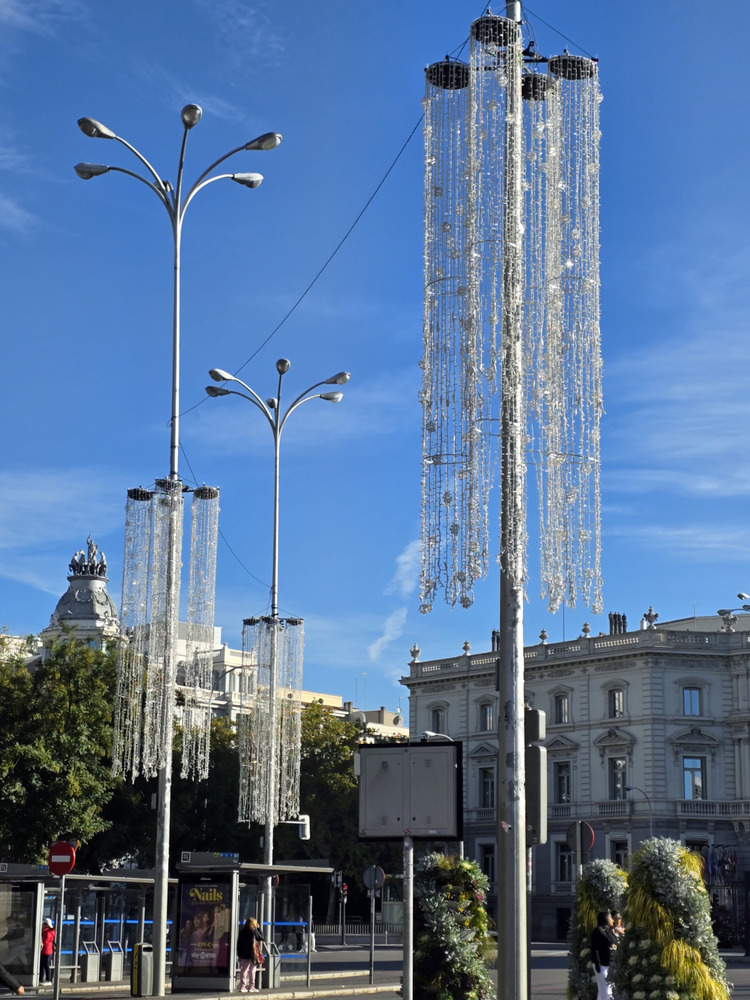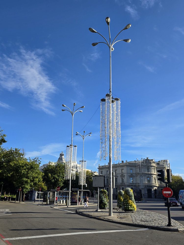 Otra de las novedades es que en las horrendas farolas autopisteras de 6 cabezas de Cibeles han colocado el mismo tipo adornos que en las farolas de calle Alcalá.