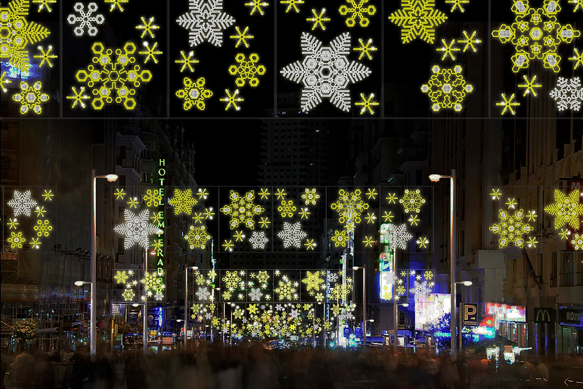 El motivo es mas invernal que otra cosa, al fin y al cabo son copos de nieve que no es exactamente navideño mas allá de qque haga frio, en Madrid si nieva suele ser enero febrero y que, a salvo de verlo encendido, son representaciones planas de estrellas, y supongo que seran estaticas salvo que titileen algunas bombillas.