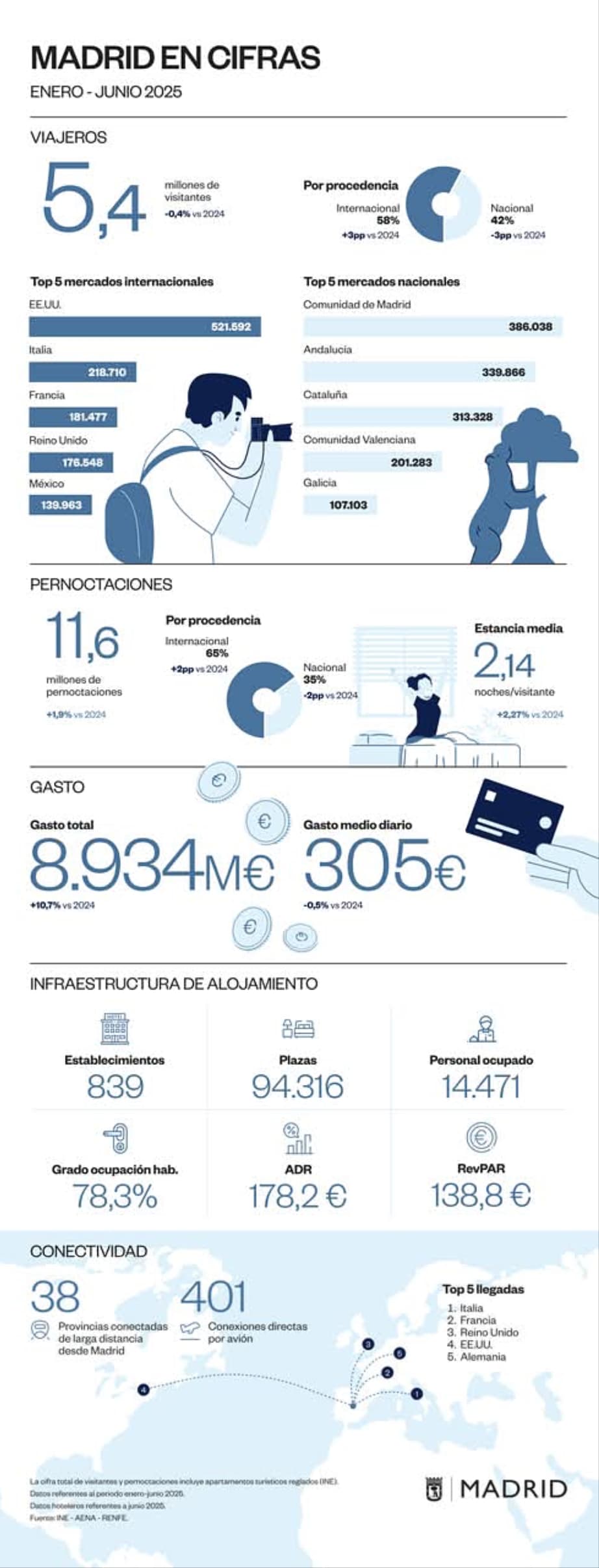 Madrid registró 11.635.113 pernoctaciones (un 1,9 % más que en 2024) y recibió 5.437.012 millones de visitantes (un 0,4 % menos que el año anterior) en el primer semestre de 2025, según los datos del Instituto Nacional de Estadística (INE). El gasto internacional total alcanzó los 8.934 millones de euros, lo que supone un incremento del 10,7 % respecto al mismo periodo del año anterior. De esta manera, el turismo internacional representa ya el 65 % de las pernoctaciones y el 58 % del total de viajeros, frente al 35 % y el 42 % del turismo nacional, respectivamente.