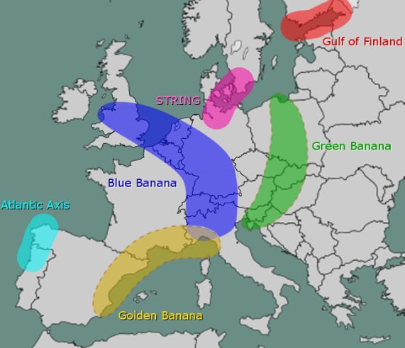 Y que la famosa blue banana, como dices, no responde a cuestiones geográficas, sino a dibujar un conjunto con las zonas más pobladas e industrializadas, aunque haya que atravesar el mar o los Alpes.