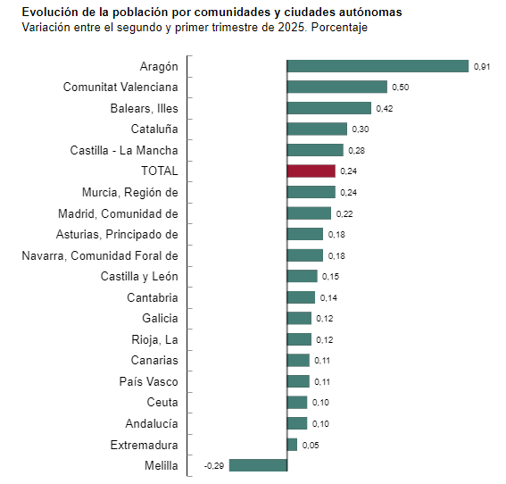 En el conjunto del país, la población también ha alcanzado un nuevo récord. A 1 de julio de 2025, España suma un total de 49.315.949 residentes, con un incremento de 119.811 personas solo durante el segundo trimestre, según las cifras provisionales de la Estadística Continua de Población (ECP). En el último año, el crecimiento ha sido de 508.475 personas.