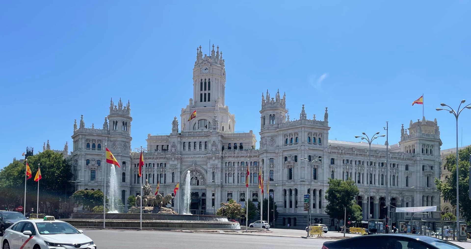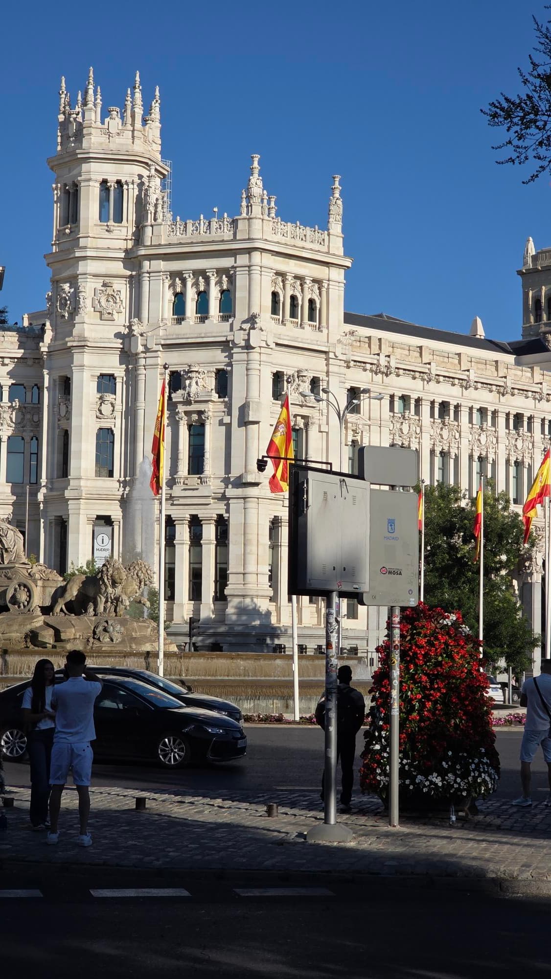 En mi opinión esos mástiles y banderas sobran, con la del Ayuntamiento ya es más que suficiente. Estropean la vista del edificio y de la fuente. Menos banderas y más limpieza y respeto por la ciudad, que está bastante abandonada. El caso de Neptuno rodeado de palos desde hace años es patético…