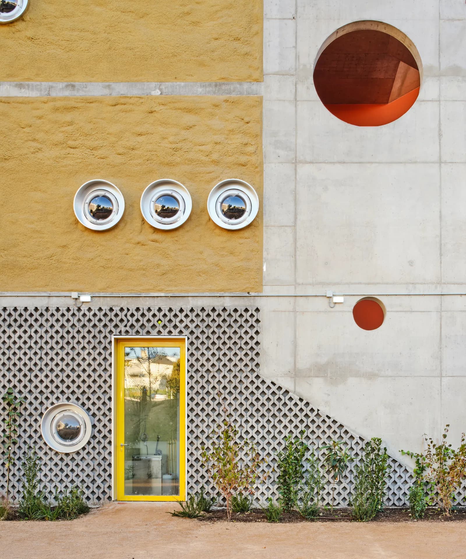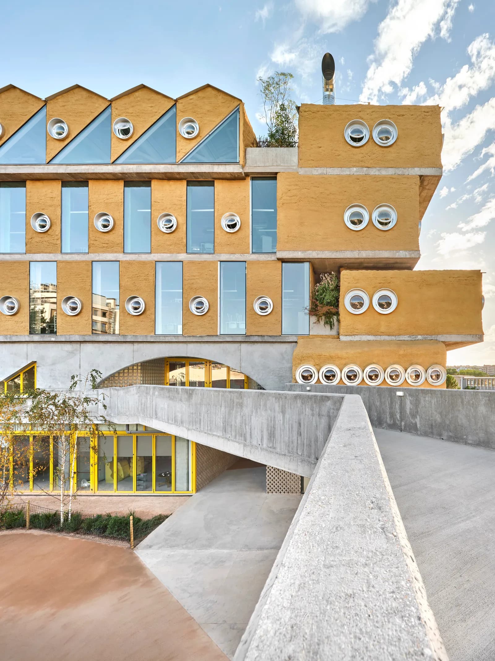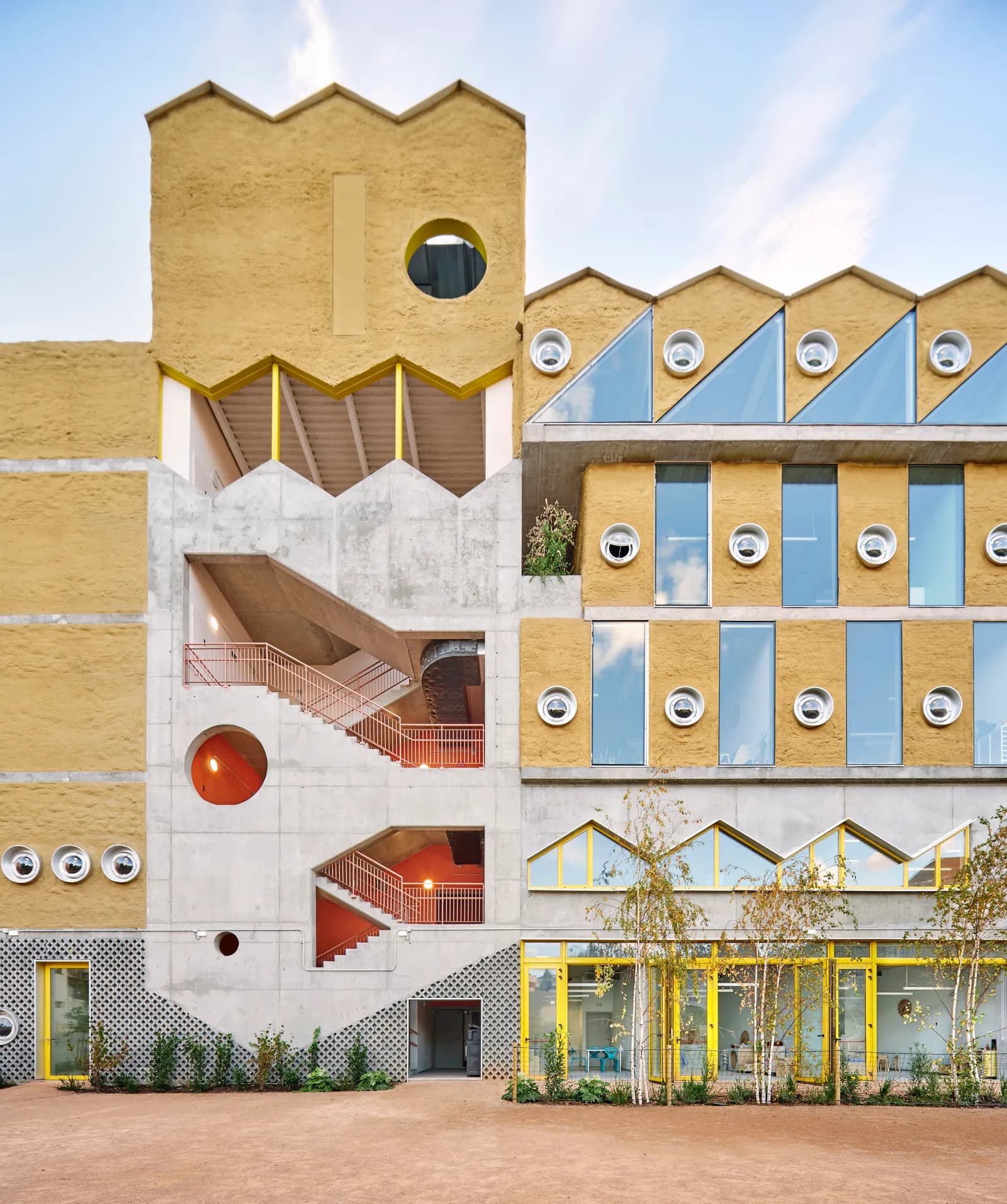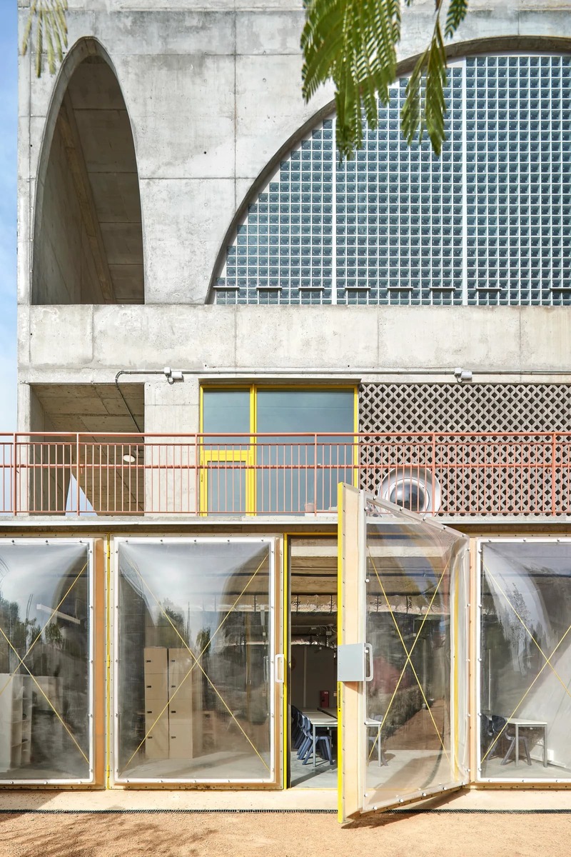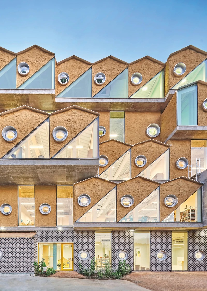 Para el desarrollo constructivo de la escuela partimos de un sistema altamente eficiente, en colaboración con Modulab, que incorpora elementos industrializados en base a unidades hexagonales, con la intención de generar una estructura orgánica y ligera, de fácil montaje y posibilidad de ampliación. Las principales ventajas de este tipo de desarrollo son la reducción de los tiempos de ejecución de obra, y por lo tanto sus costes, la consecución de mayor calidad en los acabados y el ahorro de energía en comparación con un edificio convencional. Los módulos, ensamblados en pares, conforman un conjunto de compleja geometría ejecutada a partir de dos unidades de gran sencillez, en la que cada uno de los hexágonos se dividen en dos módulos trapezoidales con cubierta a dos aguas.
