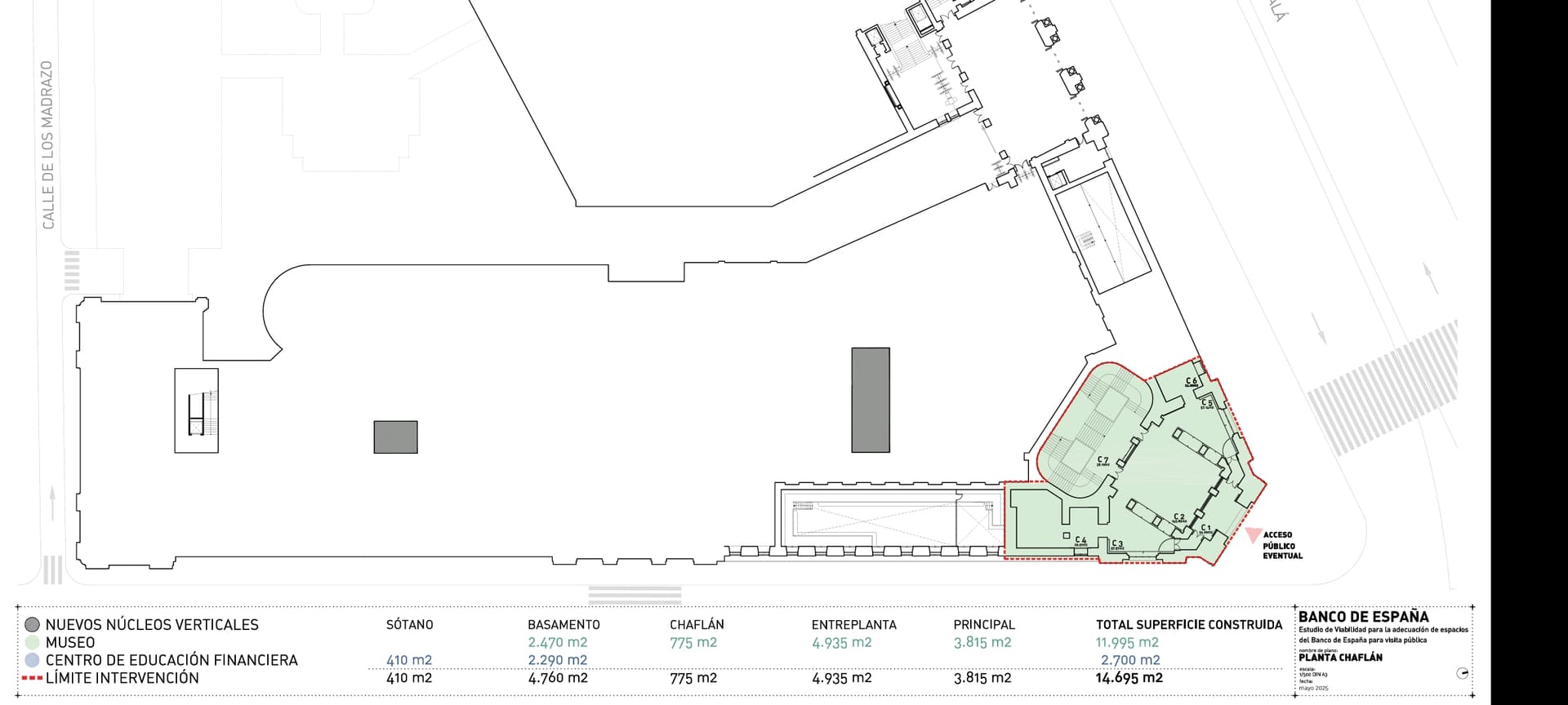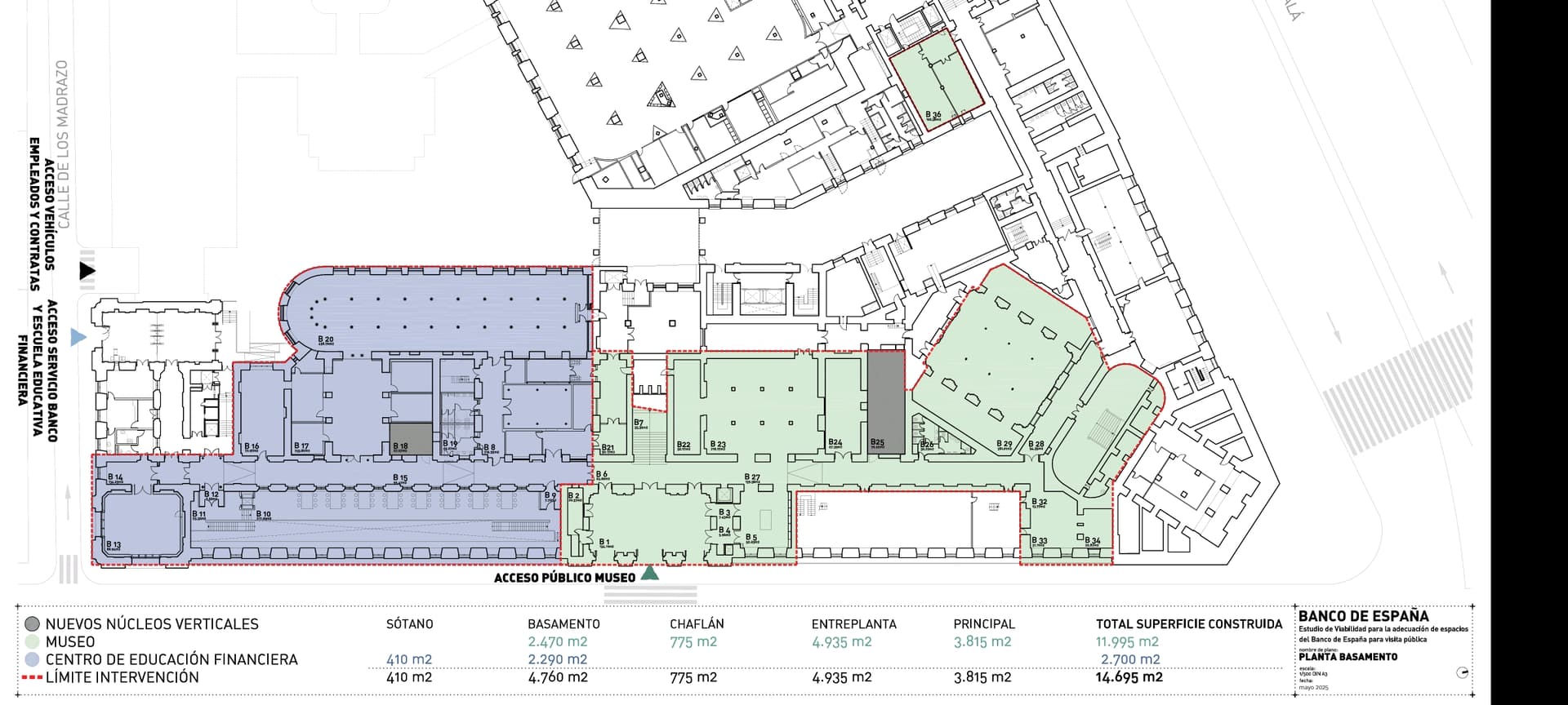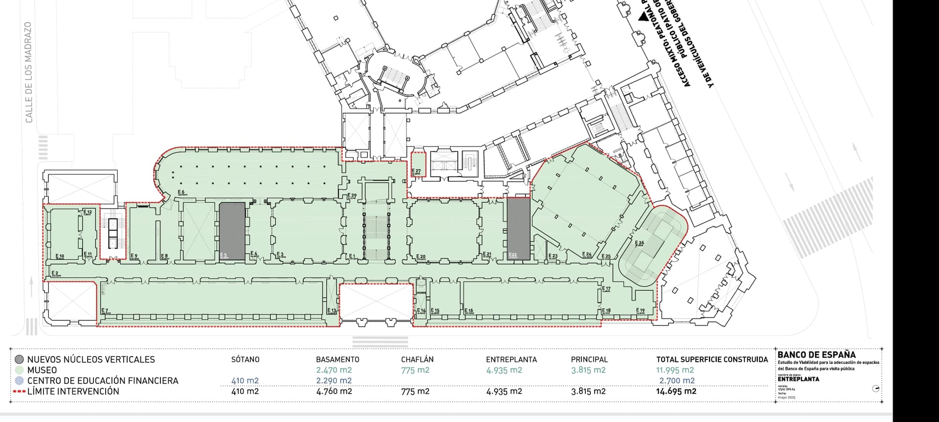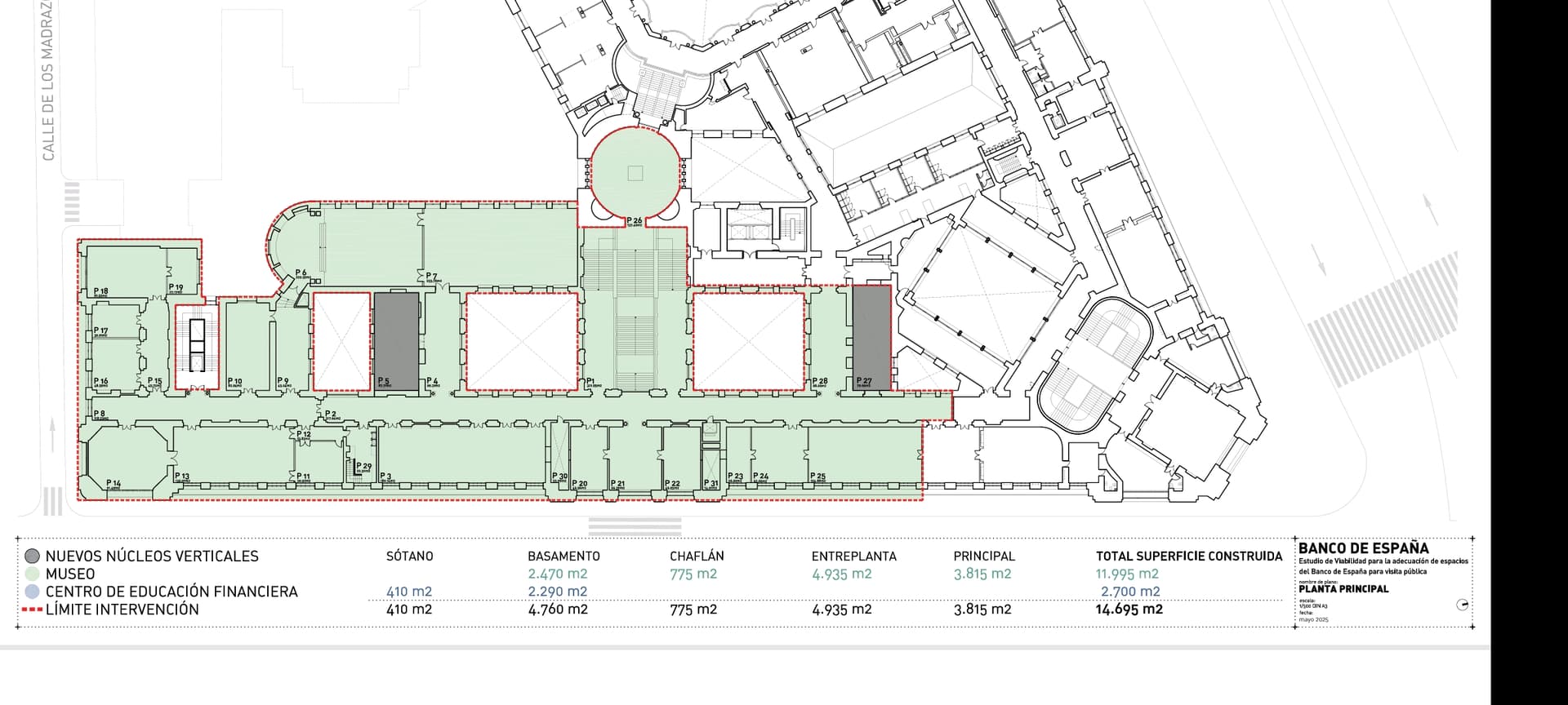 La superficie aproximada objeto de la reforma es de 16.000 m2, y pretende la creación de un espacio expositivo no solo para la colección Banco de España sino también para que dicho espacio, cuyos valores quedan recogidos en su declaración de Bien de Interés Cultural, quede expuesto al público y pueda ser compartido con la ciudadanía.
