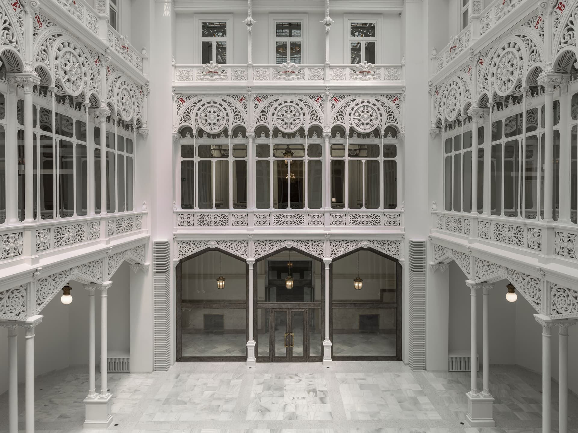 La actual sala de lectura de la biblioteca, antiguo patio de operaciones, forma parte del edificio de la primera fase del Banco de España de 1891 en la Plaza de Cibeles de Madrid, conserva las celosías de hierro colado y la estructura metálica intactas que fueron ejecutadas en la localidad de Mieres.Es un elemento relevante de la arquitectura de su época.
