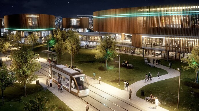 A nivel urbanístico es interesante que para lo grande que es no se vea ninguna calle con coches, todo peatonal, zonas verdes e incluso un pequeño tranvía. Imagino que todo el tráfico irá enterrado.