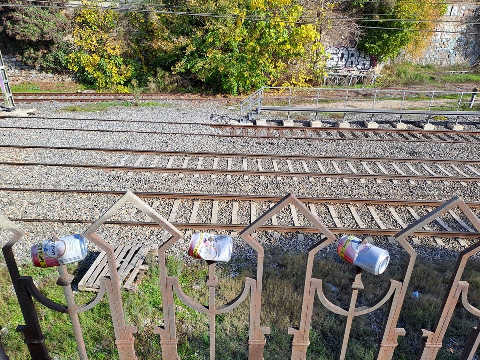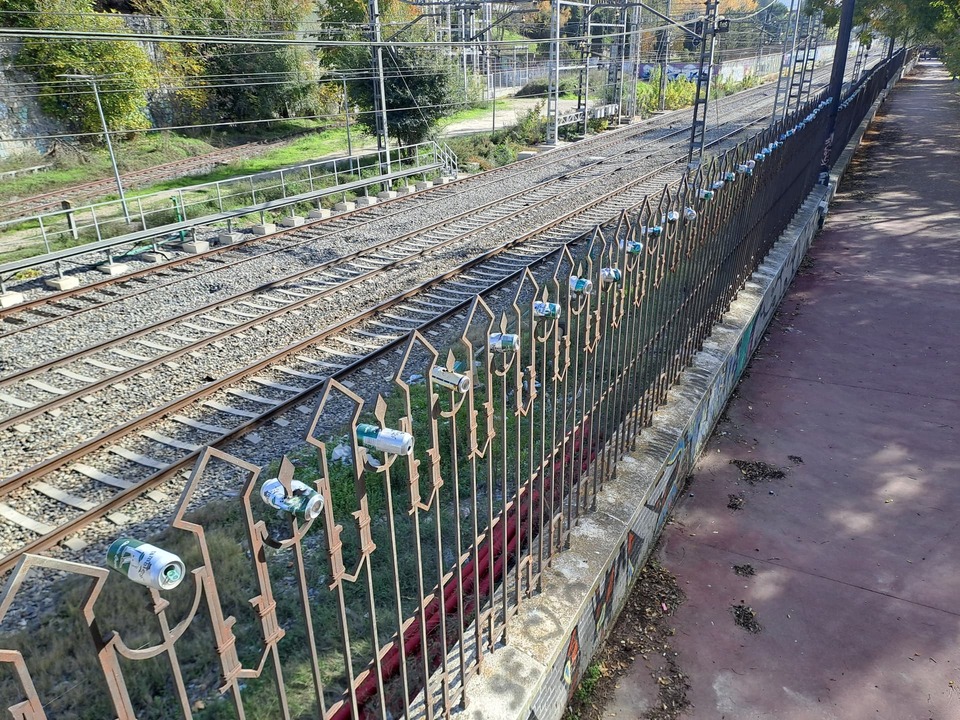 Y la verja que lleva años con latas de cerveza pinchadas en ella… y que a pesar de las múltiples quejas… ADIF no limpia…