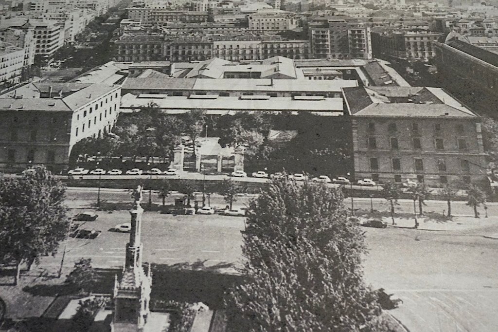 Espectacular fotografía del año 1931. El Palacio Real con Las Reales Caballerizas a sus espaldas. Fueron demolidas en 1933 para dar paso a los Jardines de Sabatini.