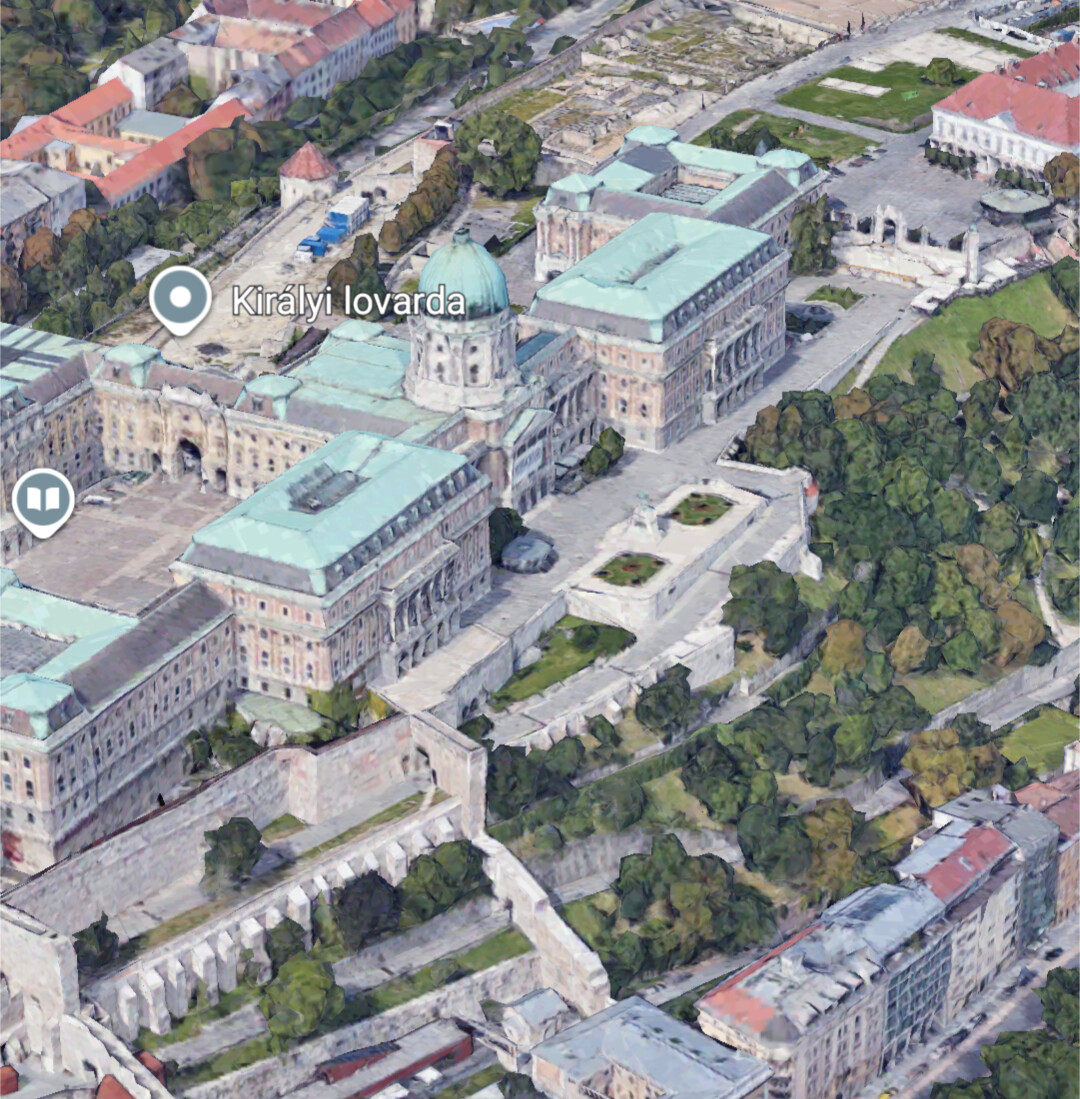 Por ejemplo, el infinitamente menos relevante palacio de Budapest, pero comparable por los grandes desniveles que lo rodean, deja los coches fuera del recinto.