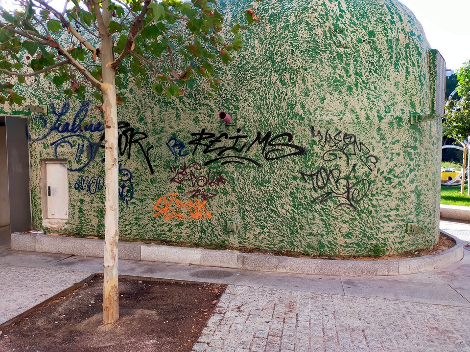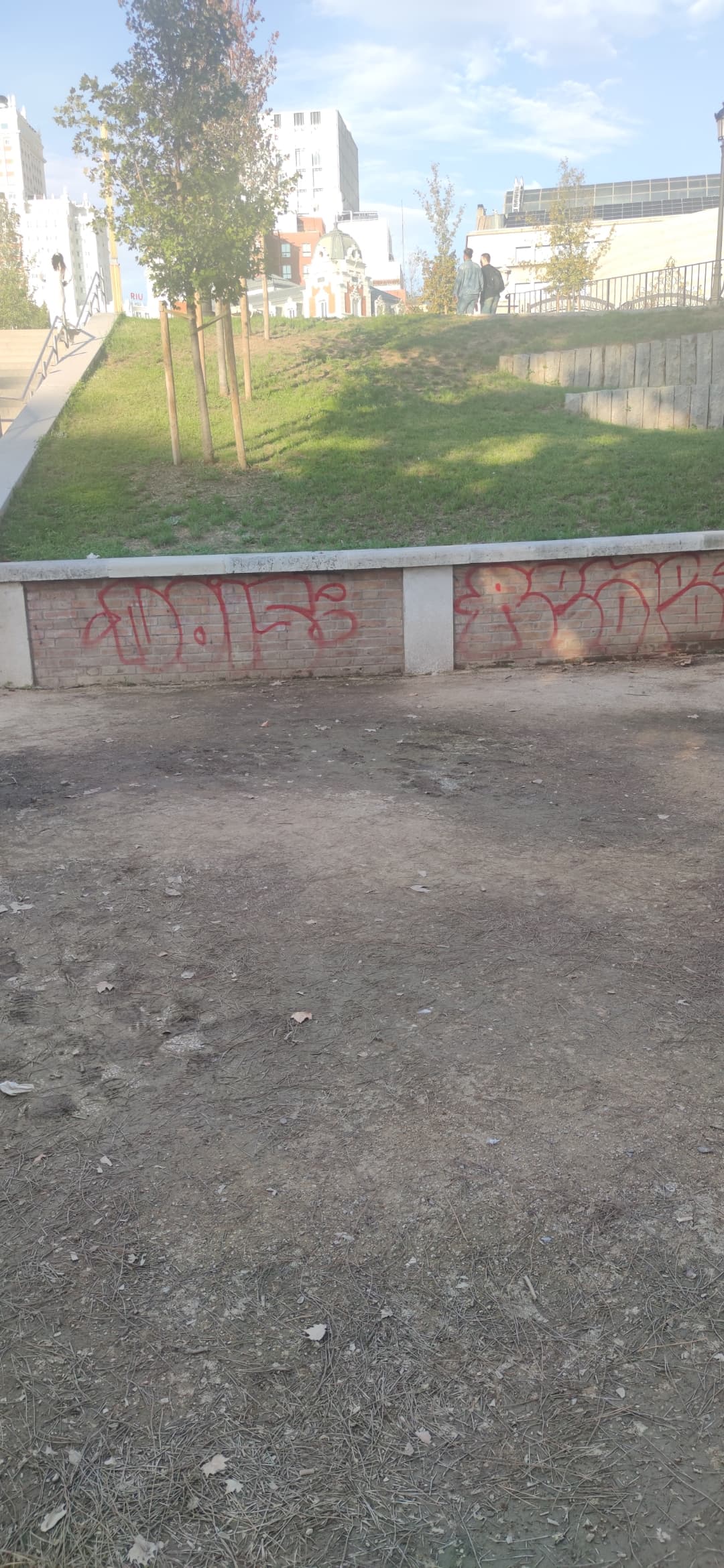Yo puse un aviso en julio de esta pintada y todavía sigue ahí, en plenos jardines de Sabatini. Escribí a Patrimonio Nacional porque pensaba que no era competencia del Ayuntamiento de Madrid y me contestaron que el Ayuntamiento es competente. No se si enviar cada día por la app la misma reclamación. Es increíble la dejadez.