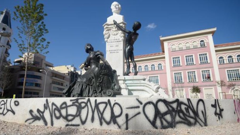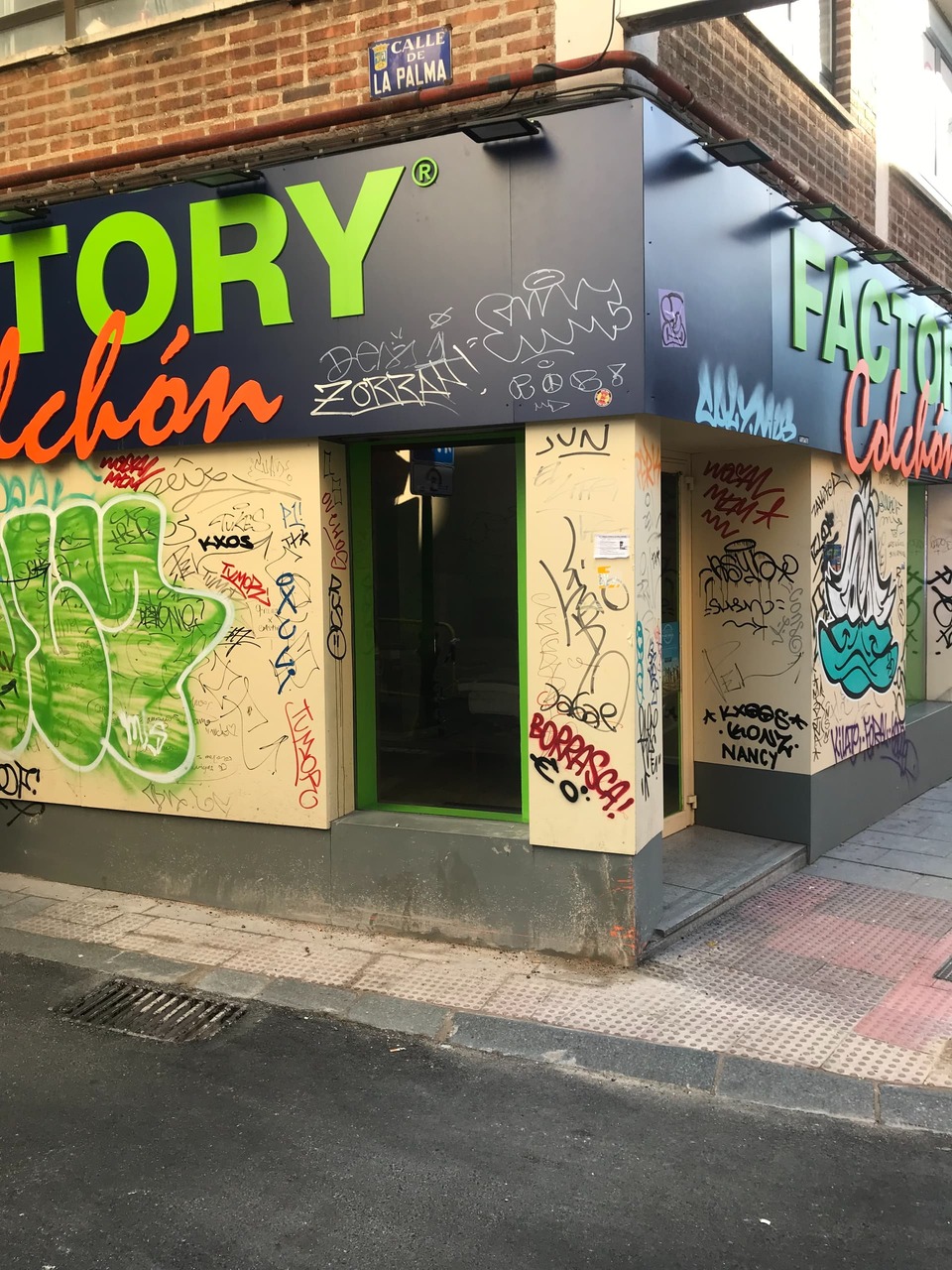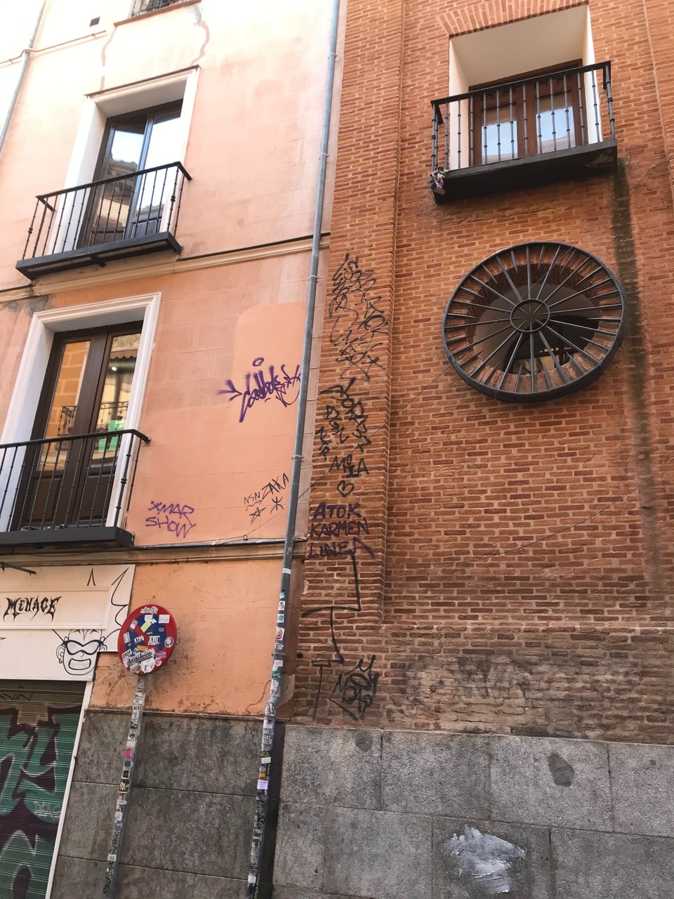 Y a pocos metros, después de años, siguen las pintadas en la Iglesia de las Maravillas. Sí, esas que decía el anterior concejal de Centro que estaban limpiando. La iglesia es BIC y es de propiedad municipal.