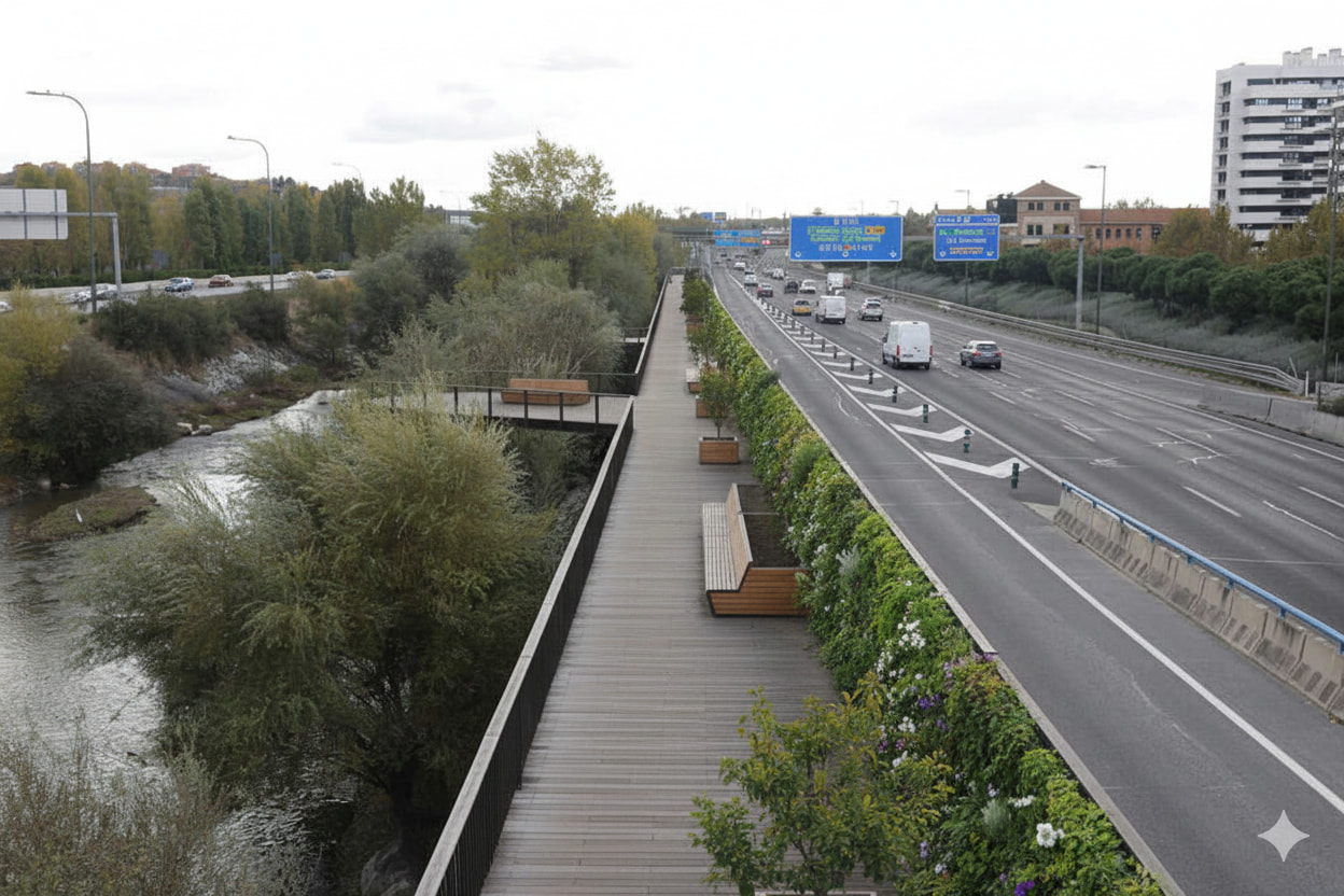 Espero que en la arena que hay entre pasarela y pantalla acústica planten vegetación… recién inaugurado y parece una pasarela del bronx sur a Bronx norte de los años 70… menuda aberración