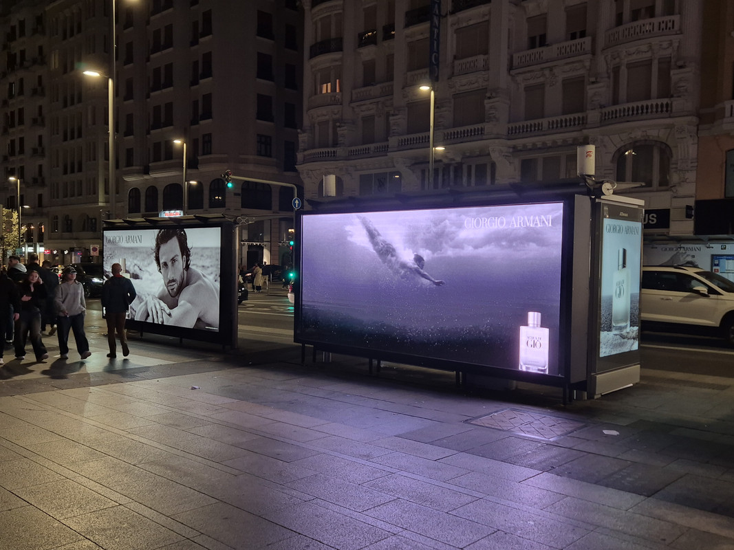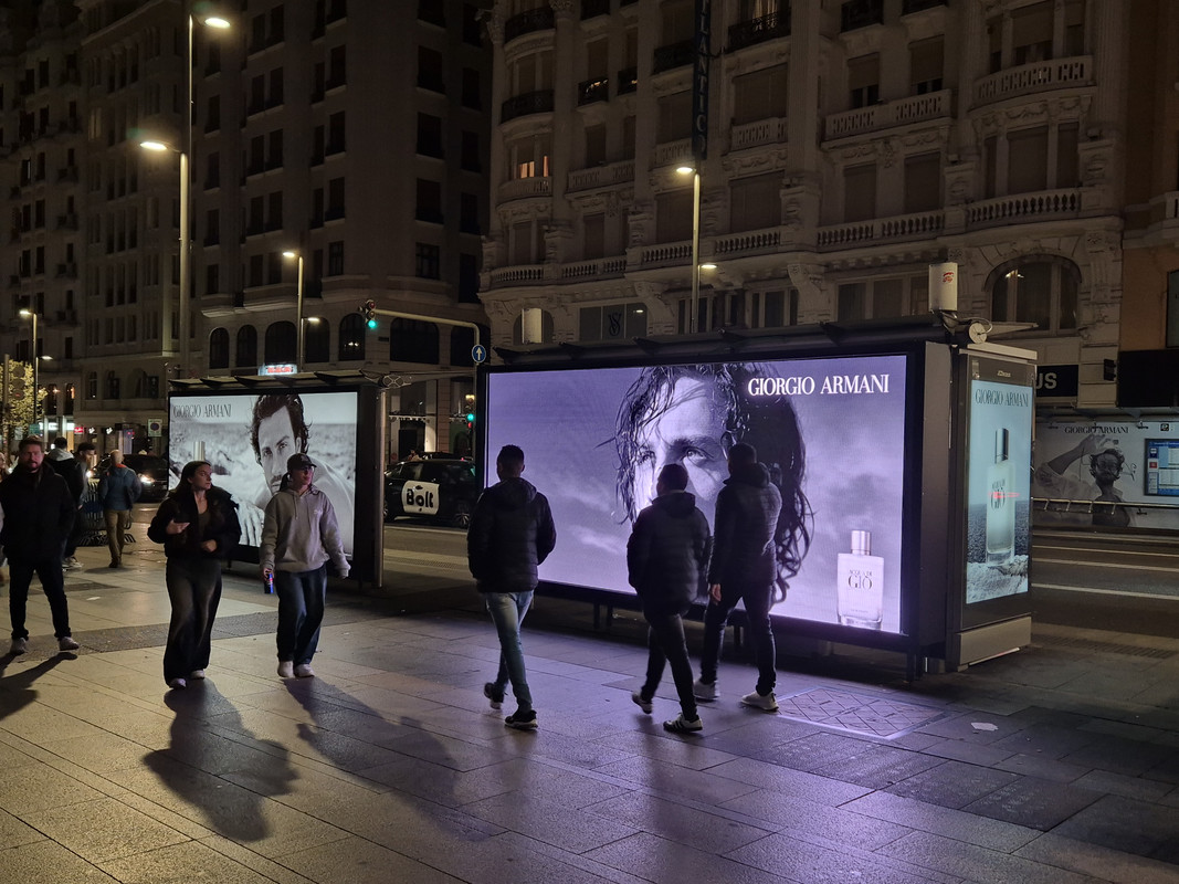 Digo que esas pantallas, en esas marquesinas de bus y en la Gran Vía, seguramente, una de las calles más cosmopolitas del mundo, me parece que quedan bien.