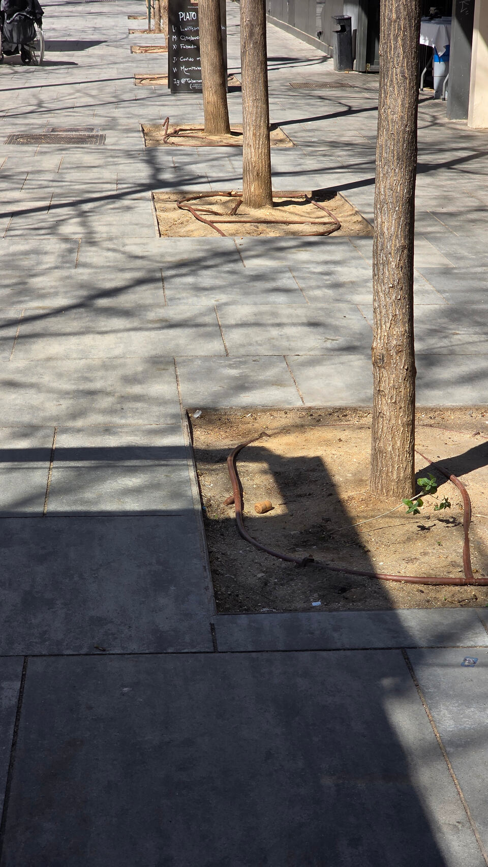 Tenemos esta mierda, un sin sentido de alcorques que pretenden ser mas “naturales” pero que en la práctica las plantas no sobreviven, no son mantenidas y se convierten en un trozo de tierra (o lodo con la lluvia) con sistemas de riego inútiles.