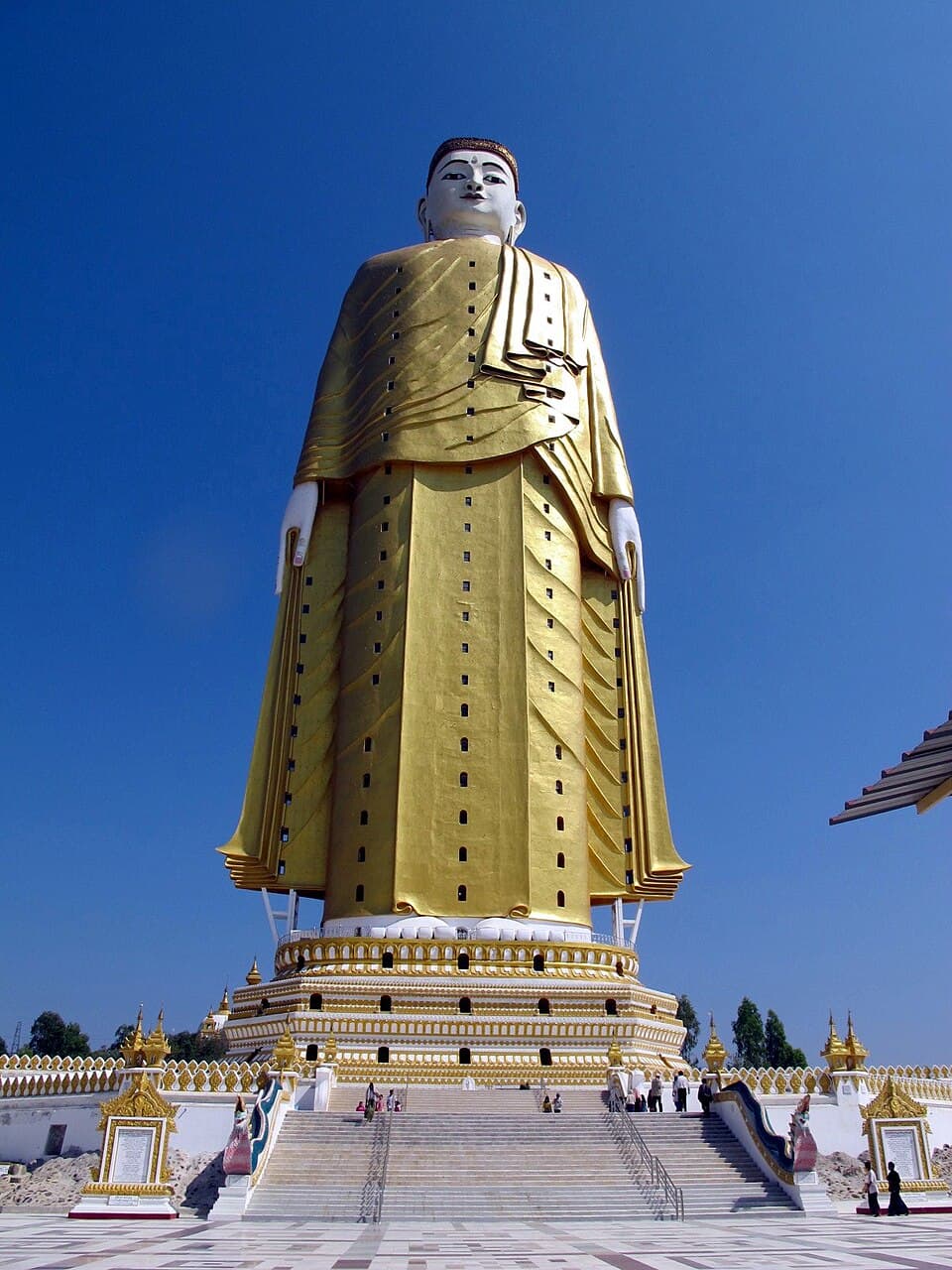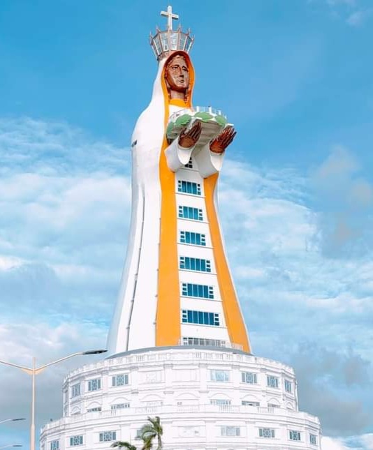 Y a nivel cristiano, Estatua de la Virgen Maria, Madre de toda Asia, Batangas, Filipinas, 98,15 metros incluido pedestal. En verdad es un edificio que incluye salas de recepción y veinte capillas marianas en el tercer piso, un salón de comidas en el cuarto, dos mini teatros en el quinto, salas de conferencias y un balcón con banderas de los países de Asia en el sexto y una terraza con vista situada en el piso quince. Los pisos séptimo al décimo albergan espacios comerciales y residenciales.