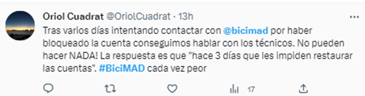 También están los detallados reportes diarios de enbicipormadrid, confirmando que aumentar un 2% el número de bicis y contratar 60 empleados más no ha resuelto el problema. El sistema informático hace aguas y ha saturado al equipo.