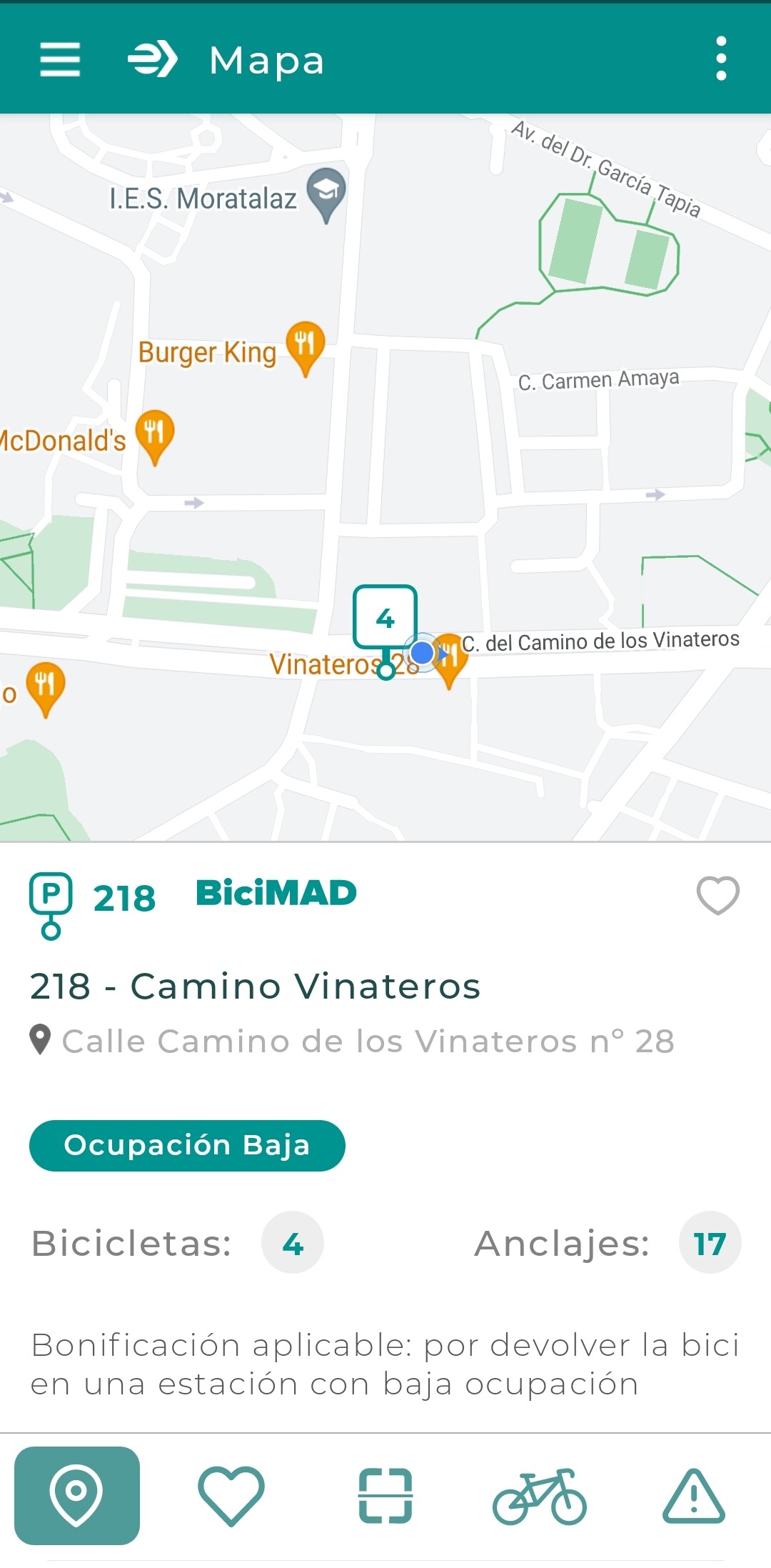 Hay 6 bicis blancas en esta estación, pero 2 en rojo. Sólo muestra las verdes, obviamente.