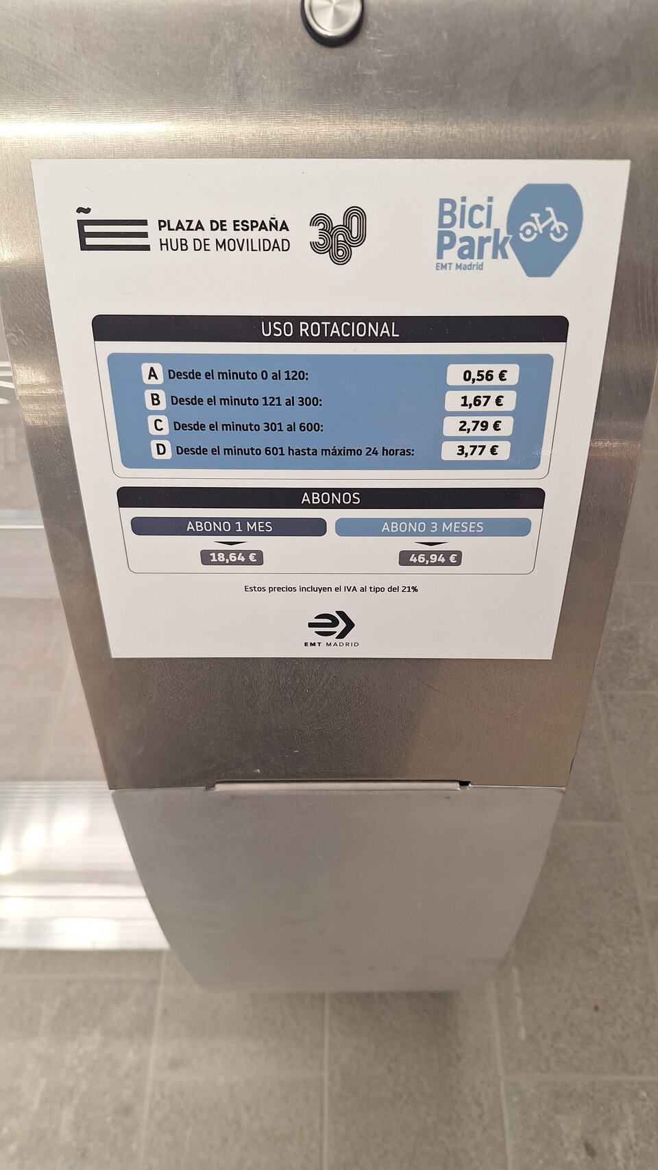He probado a salir en bicimad del nuevo hub de mobilidad 360 Plaza de España. La estación de bici, battery swap, lockers etc están situadas a la entrada, por el acceso principal del arbolito en el boquete. El interior es muy cuqui, mucha luz y colorines. Hay por ahí algún técnico del ayuntamiento que lo está dando todo con estos hubs, de veras. Todo bastante bien indicado, con iconos de bici pintados en el suelo para indicar la salida. En concepto está muy guay eso de un parking para bicis, a lo norte europeo. En la práctica pues es una estación de bicimad pequeña metida en un parking. Lo que quiere decir que para salir te comes una rampa empinada del copón, además de que la rampa que da al lado de la Casa Gallardo está adoquinada. Una delicia.