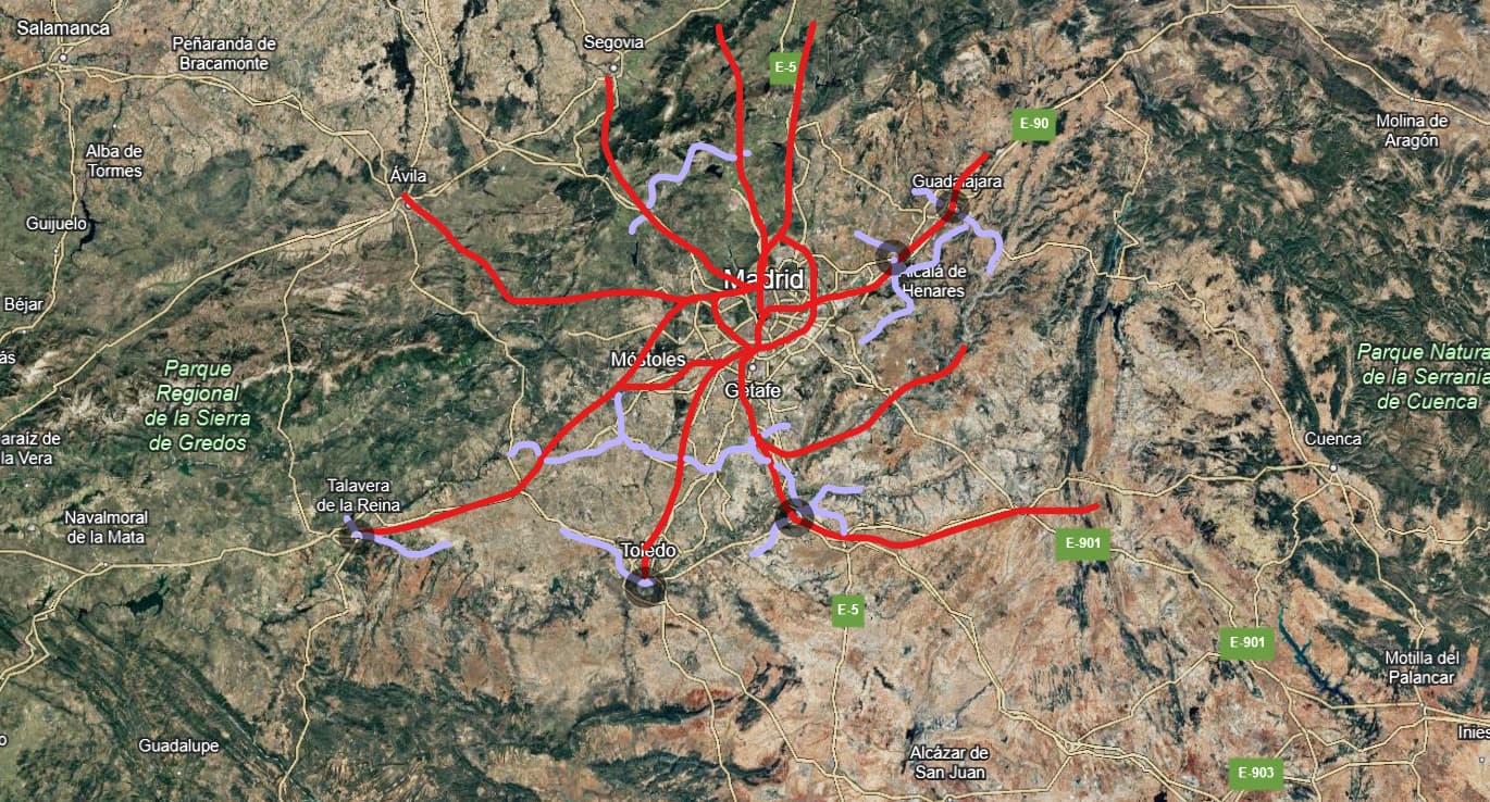 No podía evitar plantearme cómo se transformaría un “hacinado” Madrid de tener una red de Cercanías regionales como las que se ven por ahí (en rojo), con muchas frecuencias de regionales y habituales ramales y “subnodos” policéntricos (Alcalá, Guadalajara, Aranjuez, Toledo, Talavera de la Reina) con alguna línea ferroviaria propia, o de tranvía.