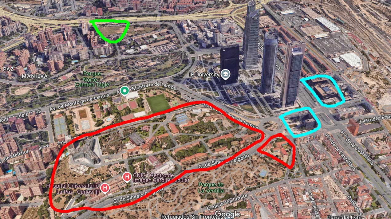 - El descampado junto a la UAM de Medicina. En el render que mostraron de la reforma de La Paz, ese terreno seguía siendo un descampado. He medido un área de 13.587 m². Situación privilegiada junto al nudo norte, aquí cabría otro pepo de +200 m.