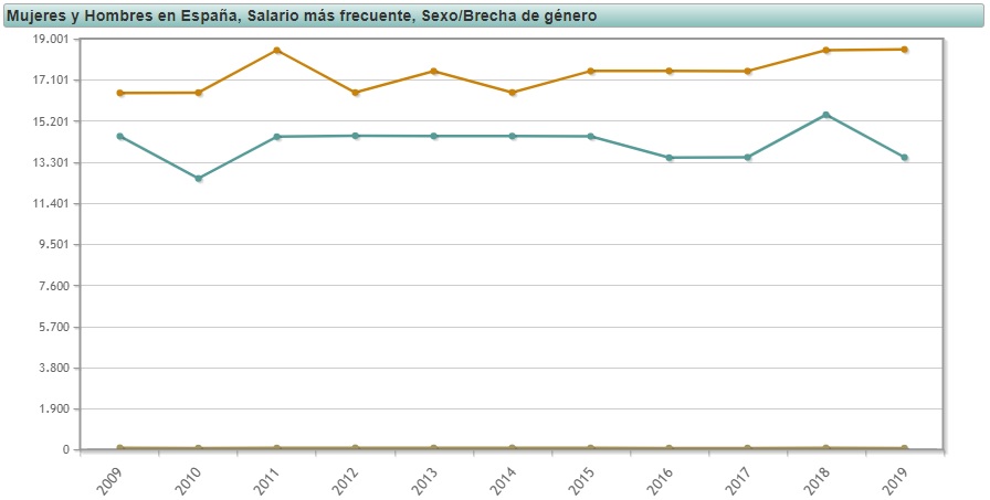 El salario más frecuente no ha cambiado entre 2009 y 2019. En hombres sube un poco y en mujeres baja otro poco. El promedio se queda 100€ al mes por arriba en este periodo, con todo lo que han subido las cosas de por medio.