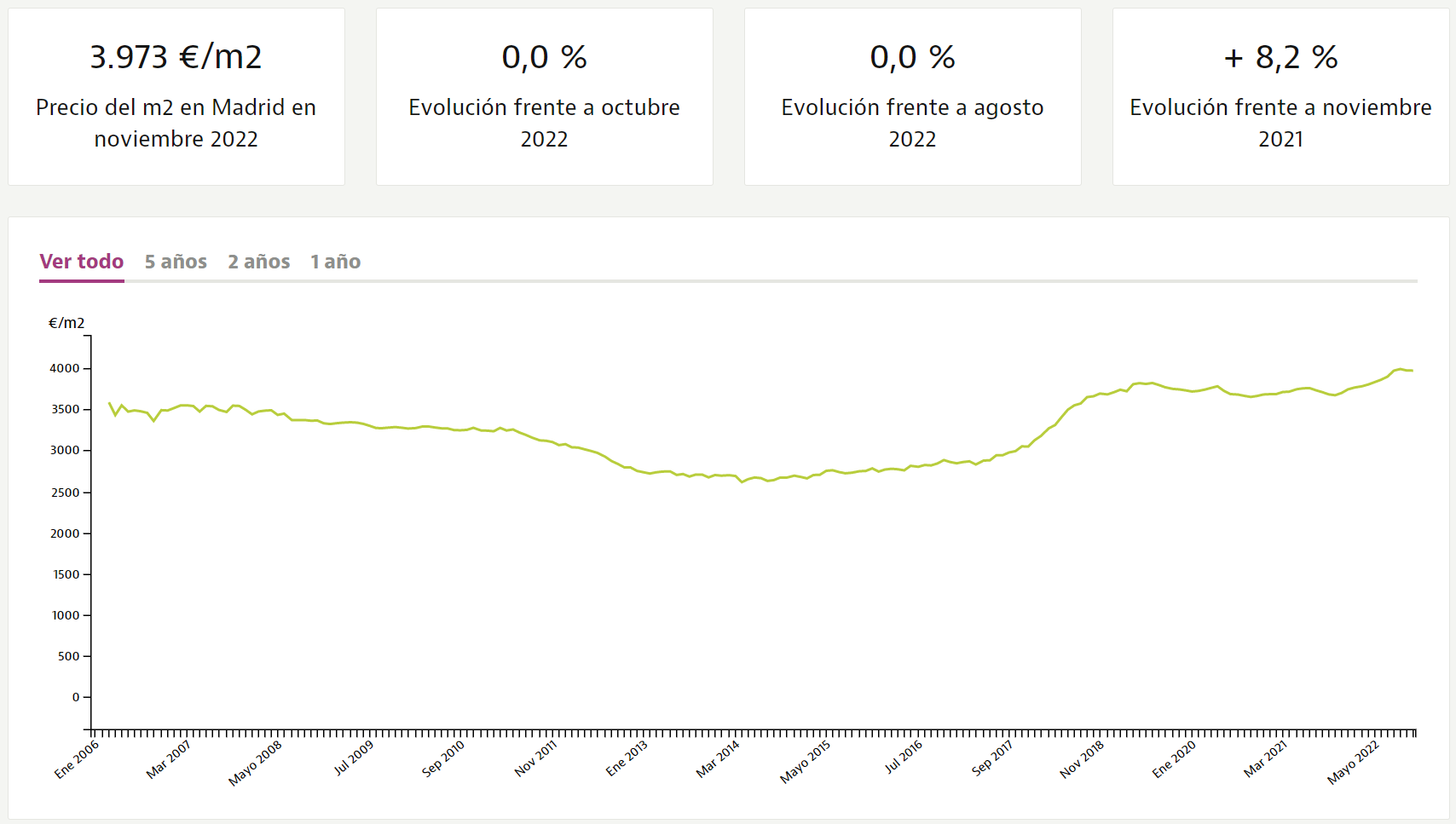 Y en Madrid, en 2017 era más bajo que en 2008. Siendo 2017 el punto en el que empieza a subir, hasta superar en 400e los precios de entonces: