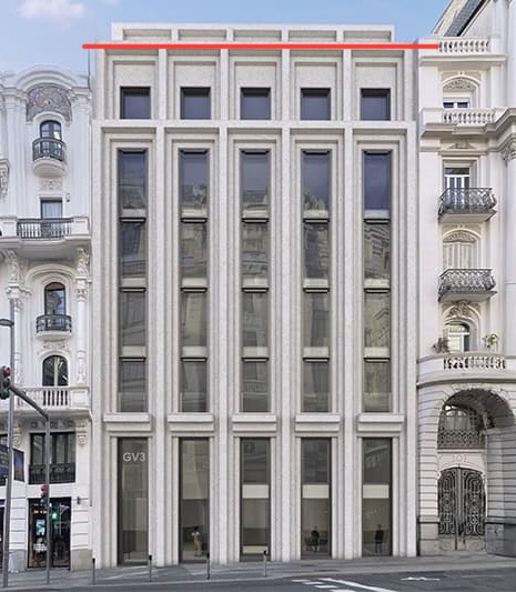 Parece que la altura de la fachada (no del último cuerpo) es ligeramente más baja y la sexta altura está retranqueada con respecto al edificio actual.