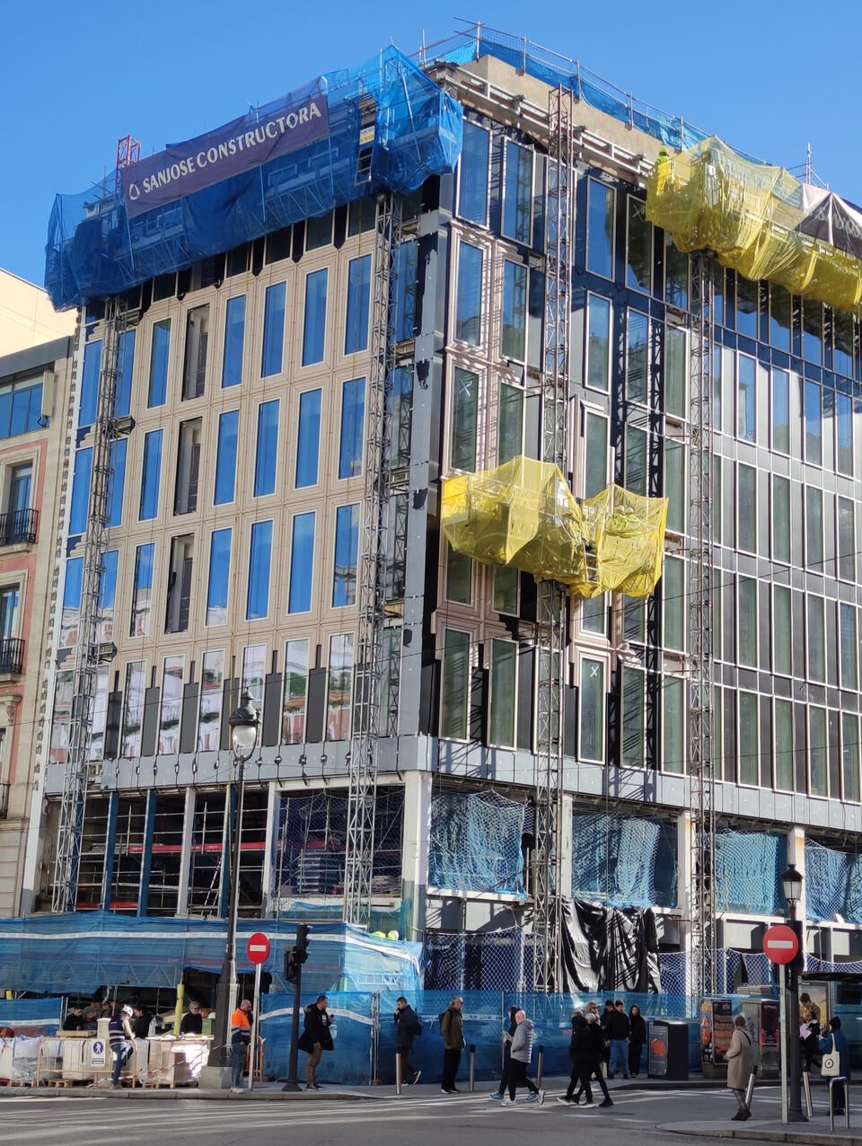Todavía es pronto para tener una opinión fundada, pero me gusta el color de las piezas cerámicas y su juego con la luz. Quiero ver cómo finalizan el esquinazo con las molduras cerámicas y la zona de la última planta. No sé si os habéis dado cuenta, en la planta quinta y como aparece en la memoria del proyecto, los ventanales son ligeramente más grandes que los de las plantas inferiores. Sinceramente creo que va a quedar mejor que en los render. Quizás es solo un deseo mío jaja. Un saludo