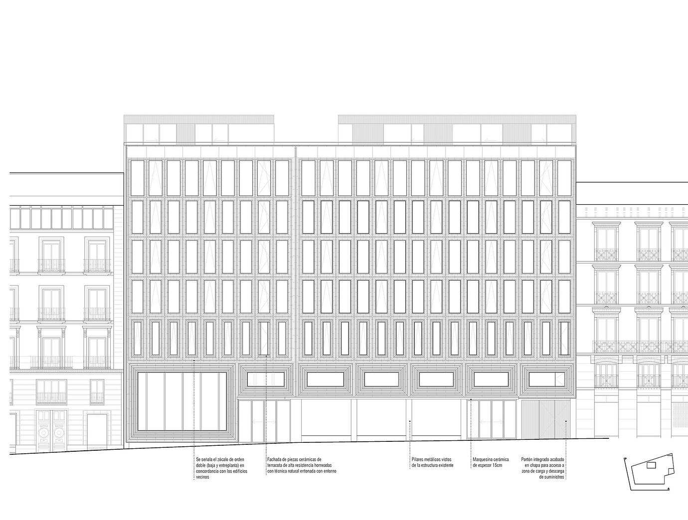 La propuesta se concibe como un único alzado que dobla la esquina, y no como la composición de dos fachadas distintas y es este principio es el que ha generado la toma de varias decisiones “arquitectónicas”, que tratan de resolver la complicación que el pilar en esquina, (del edificio original), supone para la continuidad de la fachada de la calle de Alcalá sobre la de Cedaceros al doblar la esquina.