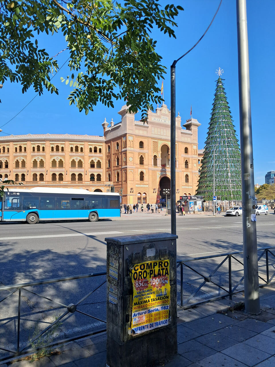 Se dirige a una farola, así que totalmente incomprensible. Si a todo este desastre (incluido el pedazo árbol navideño, que había cientos de metros cuadrados disponibles donde “plantarlo” sin necesidad de hacerlo frente a la puerta principal) le sumamos las obras de la entrada al metro, las propias obras de la plaza, y las de parque ventas, estamos en el km 0 del jaleo.