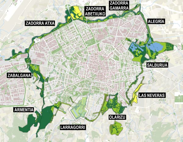 En el modelo vitoriano las actuaciones se dieron por fases también, adecuando los parques que lo forman, después elaborando los caminos de unión y luego trabajando en las áreas adyacentes a esos caminos que funcionan como nexos de unión, utilizando elementos naturales como cursos de agua para crear bosques de ribera. Eso sí, el clima vitoriano facilita estos proyectos ya que la tasa de precipitación es más o menos el doble a la que hay en Madrid.