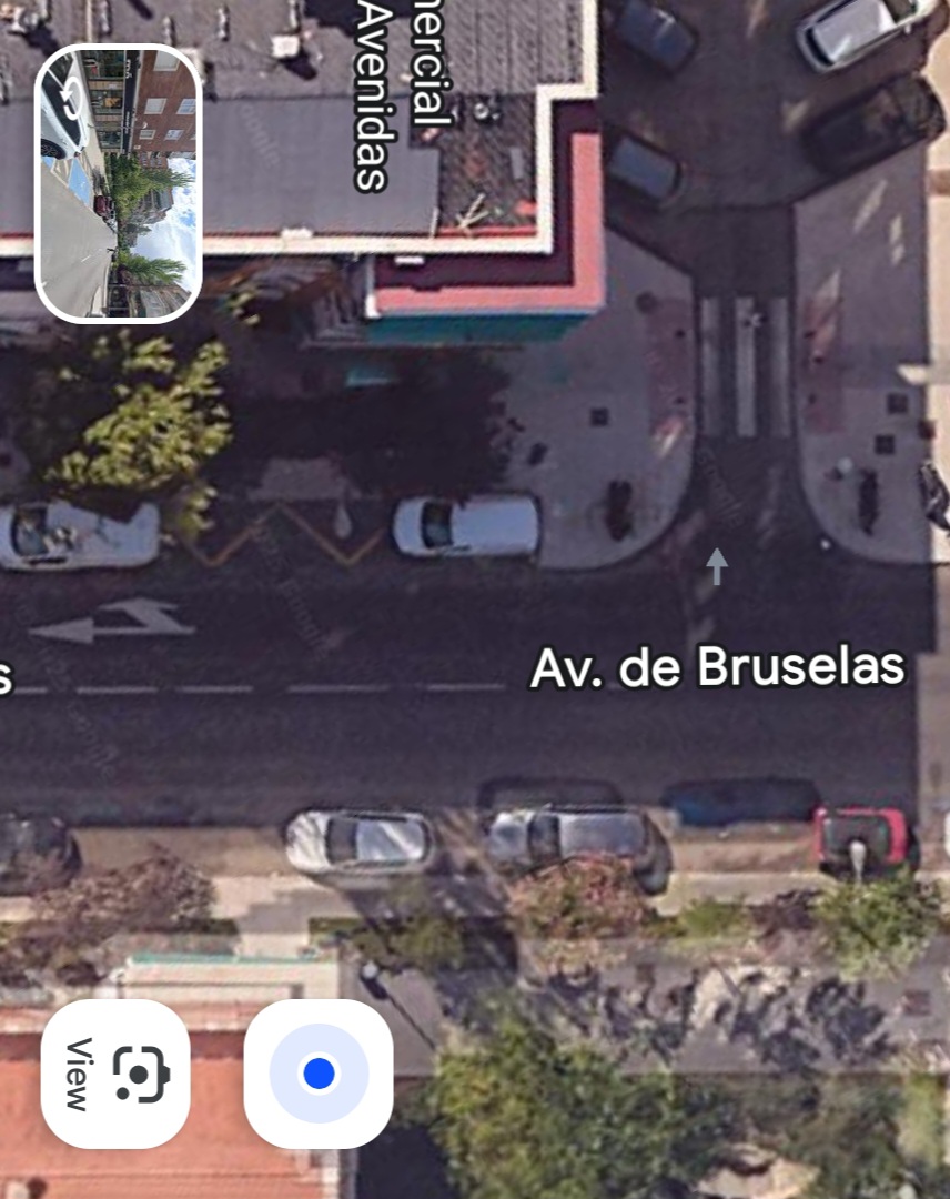 Bueno, mira, las aceras no son las de la Calle de Alcalá, pero mira, aparte de los dos carriles y la plaza de parking, hay, una acera bastante menos exigua que muchas aceras desarrollistas, arboles, setos bancos, espacio hasta llegar a las fachadas.