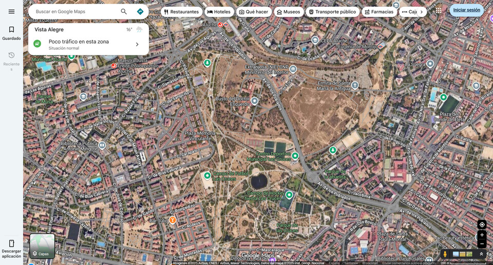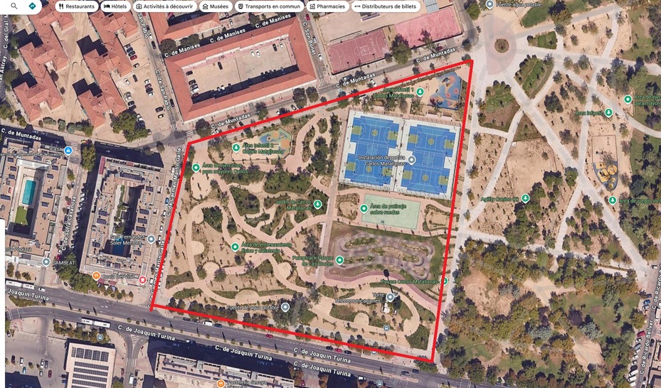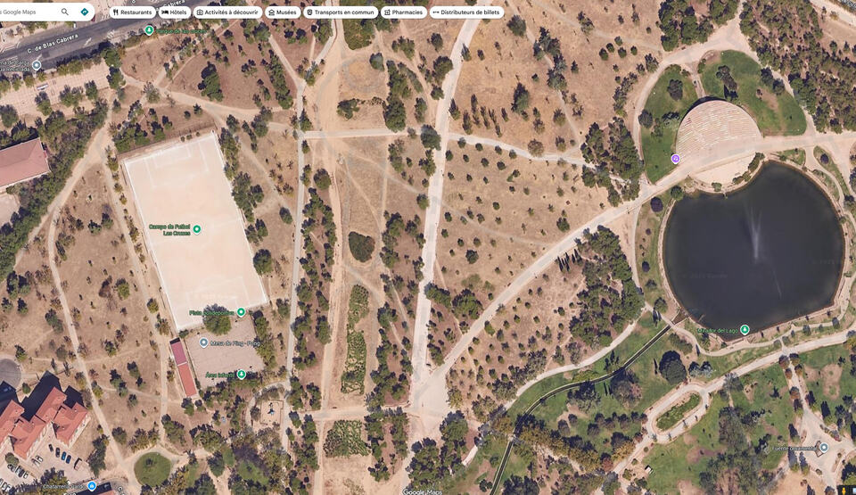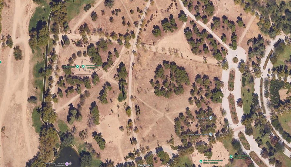 Para ir abriendo boca una foto de Google Maps que efectivamente muestra muy poco arbolado para un parque tan maduro ya. Se evidencia el poco mantenimiento y en general poco interés.