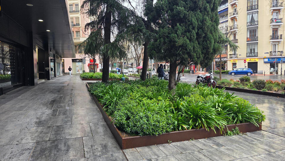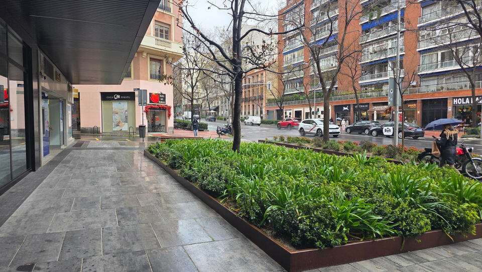 Mismos materiales, misma fecha, misma zona, mismos modelos de alcorque, mismo trasiego de gente (incluso más que las zonas que están peladas en lo que gestiona el ayuntamiento) Y lucen así de bien.