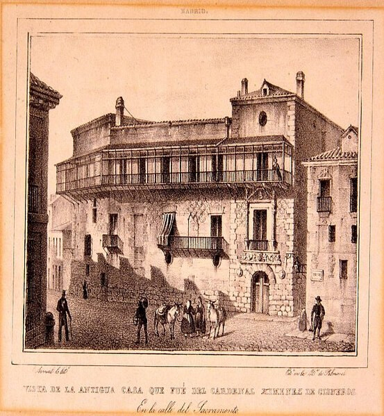 Nuestra Casa Cisneros, nuestro palacio renacentista más conocido, construido como 100 años después que nuestra Torre de los Lujanes, más o menos. Hoy la vemos tal cual la dejó nuestro gran Luis Bellido. Pero os he dicho que podemos encontrar esgrafiados en ella. Y si los encontramos, en los grabados antiguos. He aquí el grabado: